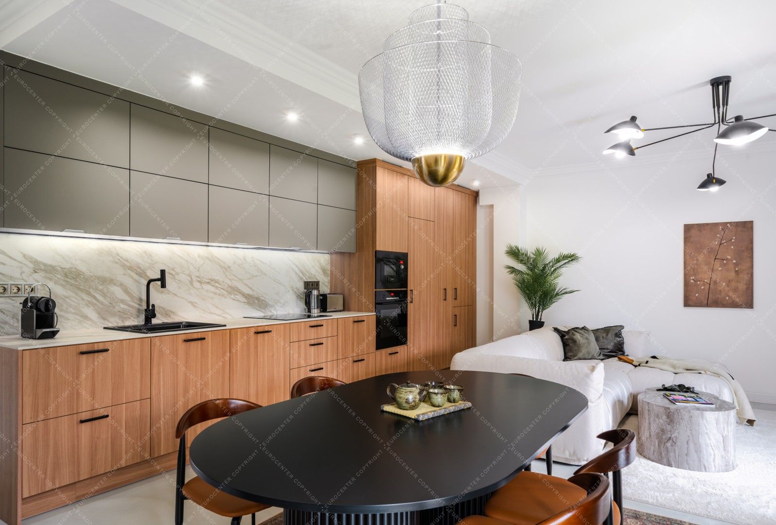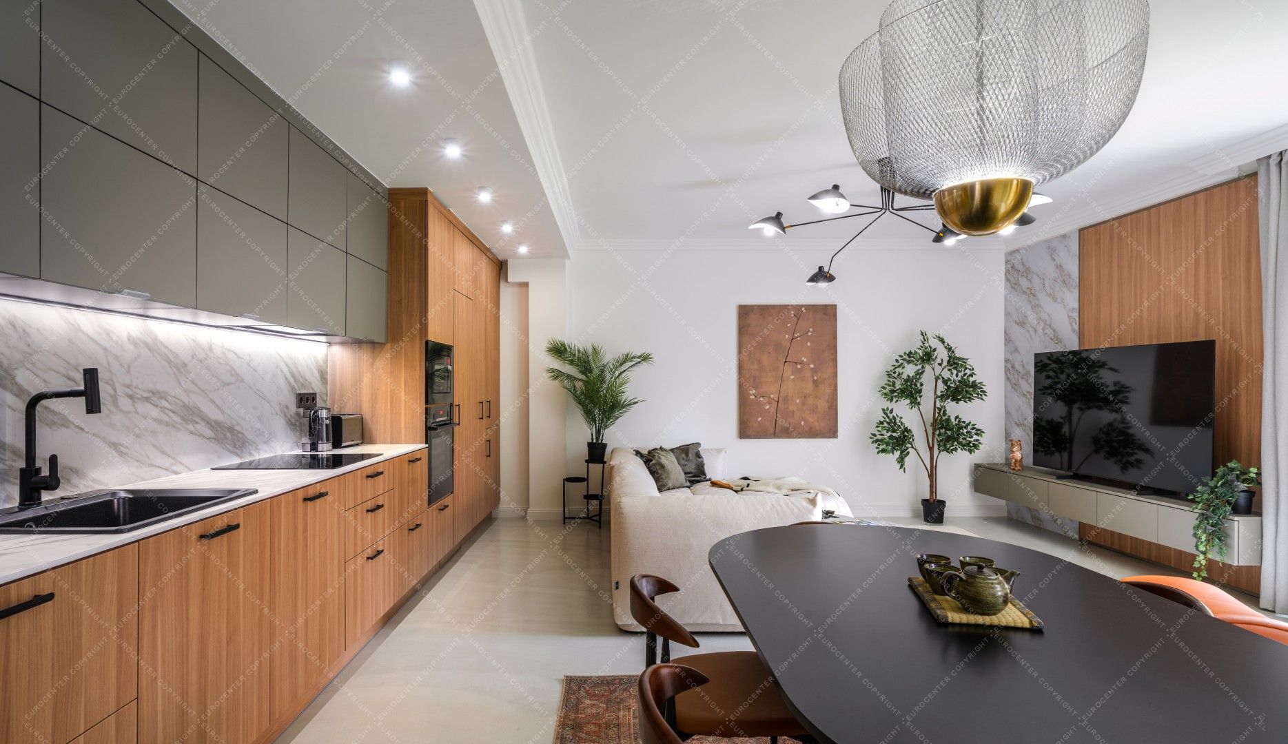 We enter the 110 m2 apartment with its fortunate floor plan through a bright winter garden with underfloor heating, where we can safely leave our shoes, coats, and keys. Here we are greeted by the spacious and bright trio of living room, kitchen and dining room in one space, leading on to the parents' and children's bedrooms and bathrooms.