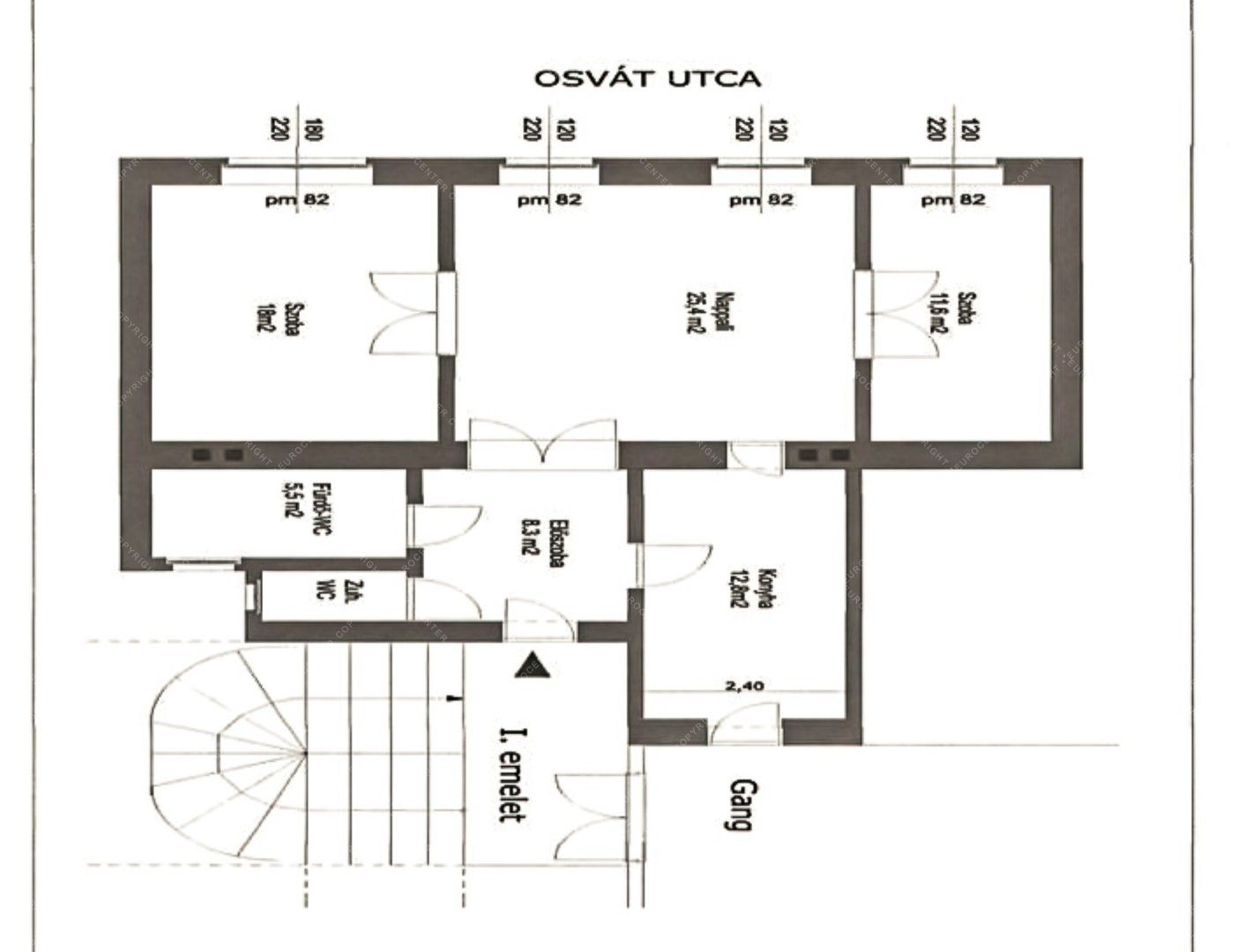 The apartment has four street-facing and one courtyard-facing window, fitted with double-glazed, insulated windows, making it bright yet quiet. A security entrance door and gas central heating (cirko) ensure comfort.