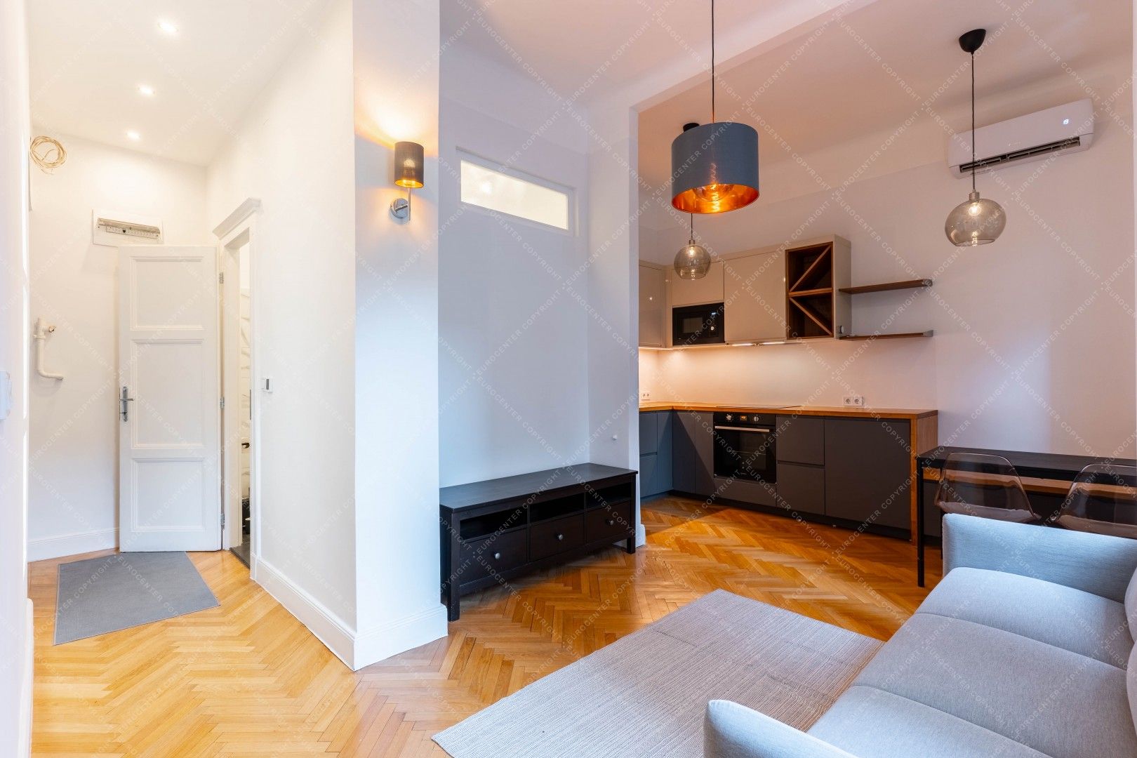 Two separate entrances, with hallway fully furnished, living room with open-plan kitchen, well equipped air-conditioned apartment in a quiet condominium.