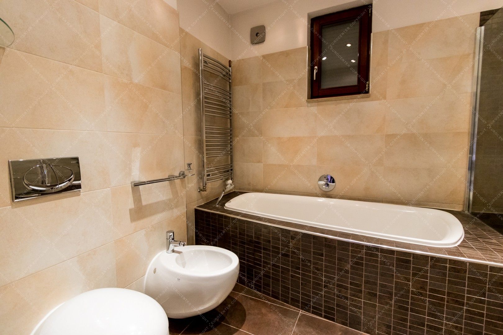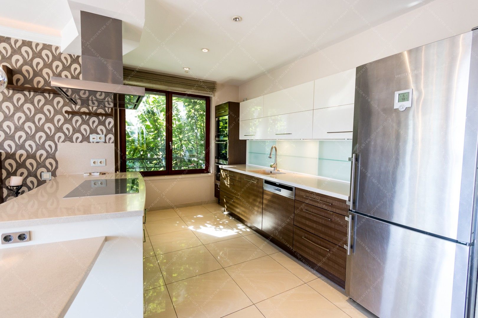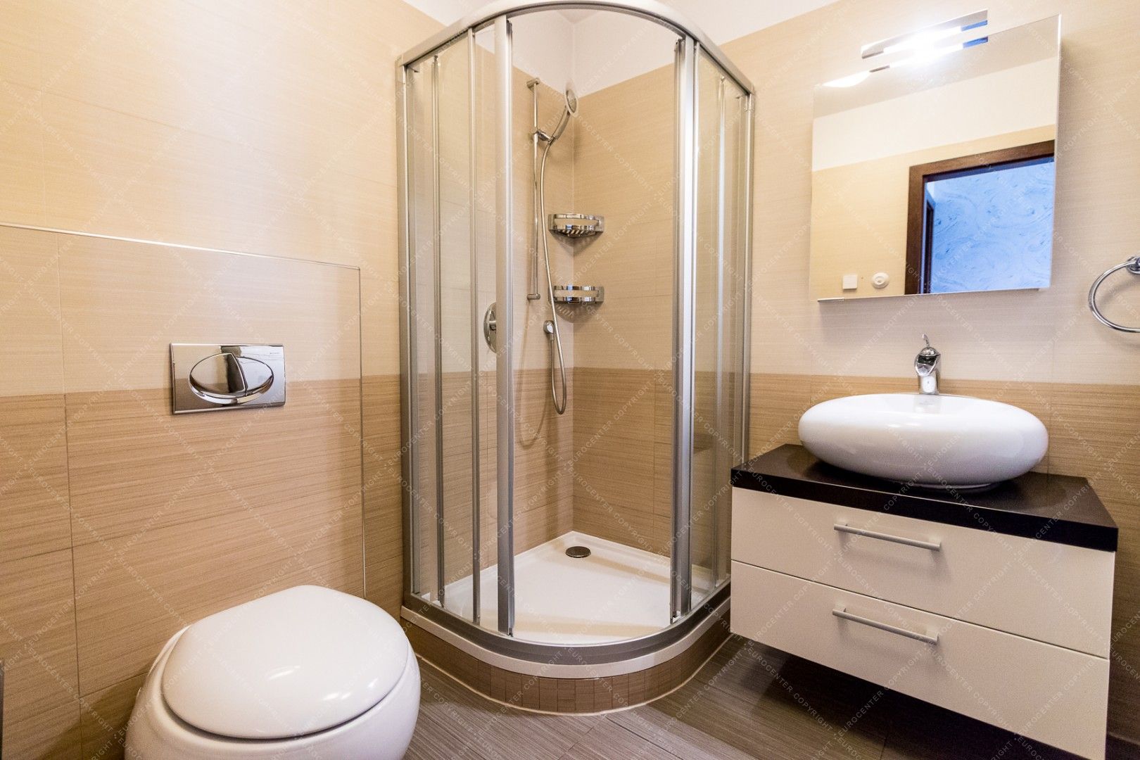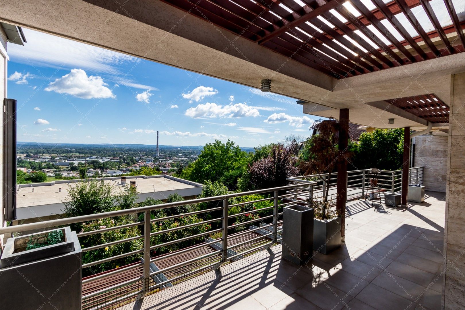 The newly built, panoramic property is equipped with alarm system and air conditioning as well. It has a private garden for shared use.