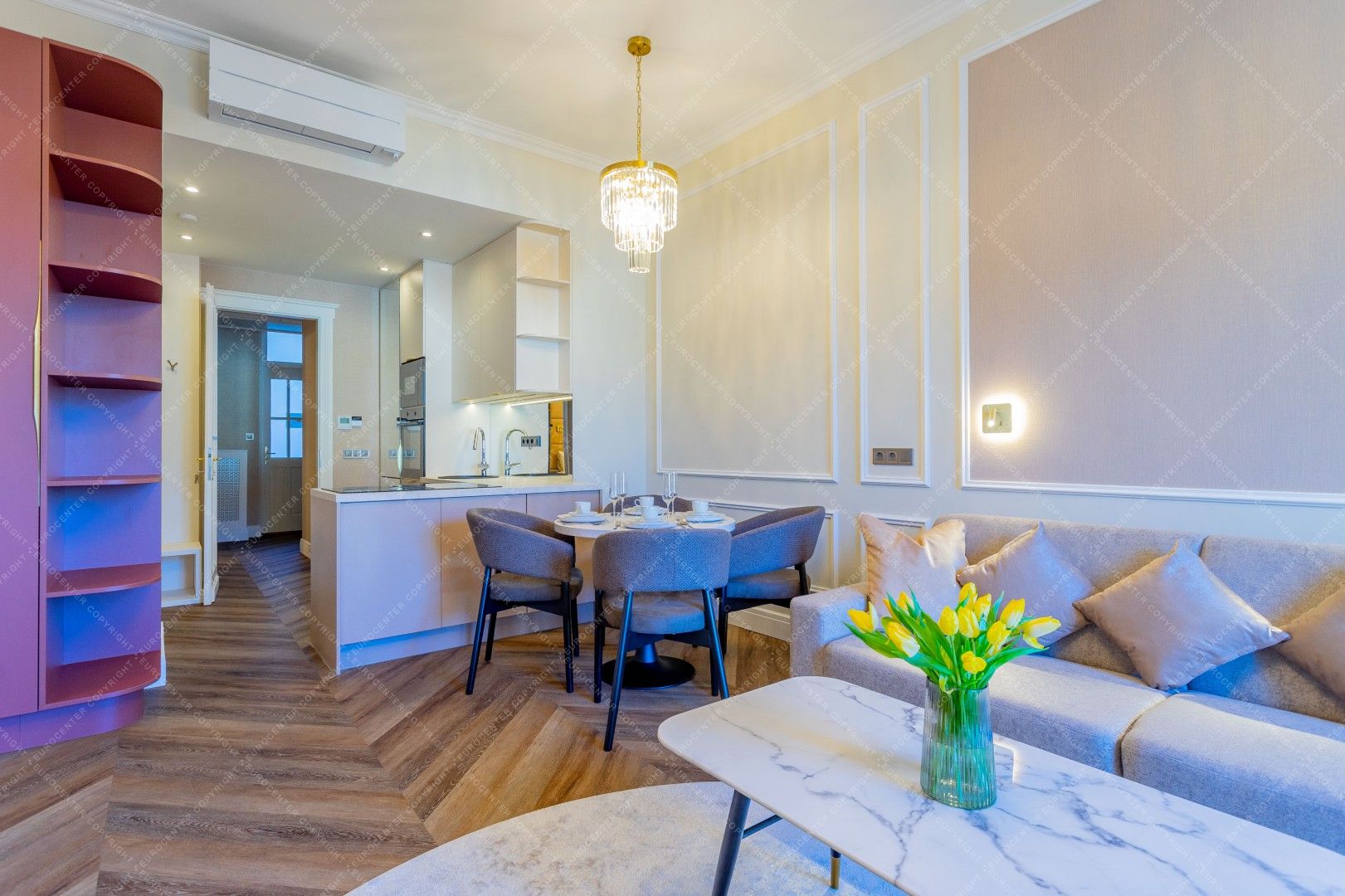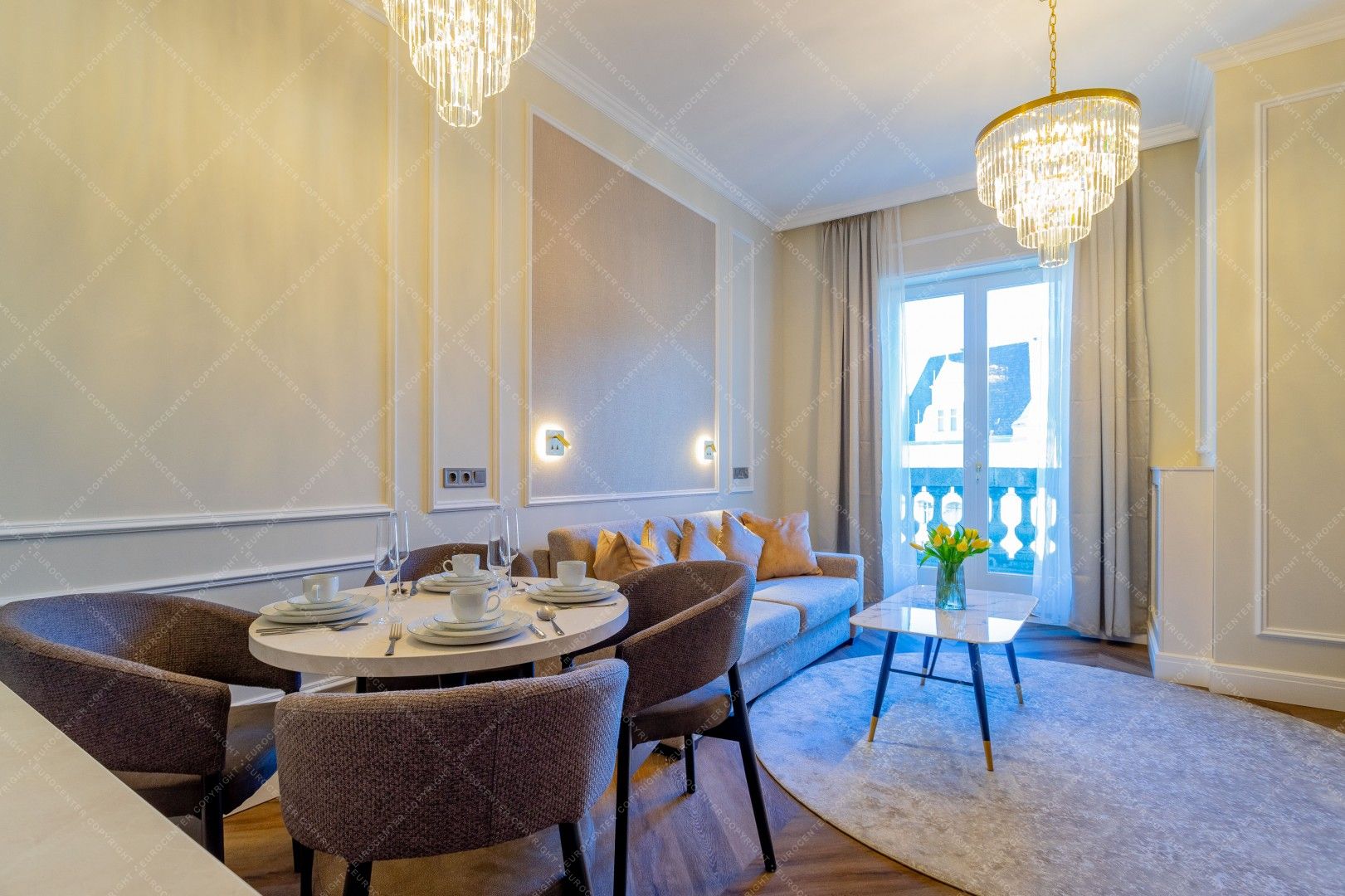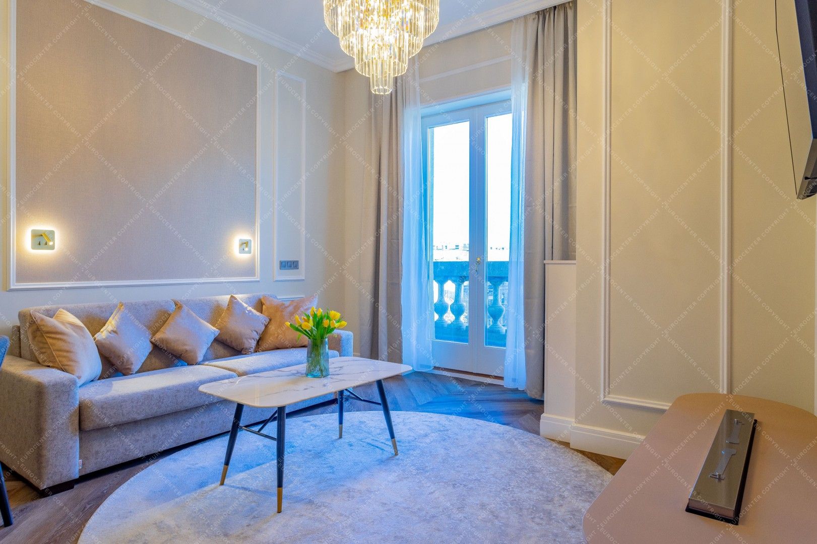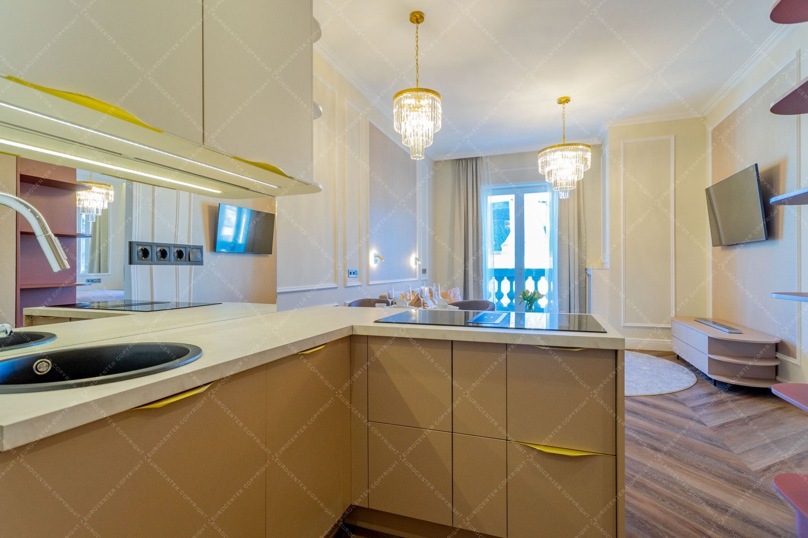 The apartment features a practical layout with 2 bedrooms with double beds, 2 bathrooms (one with bathtub and shower, one with bathtub), an open-plan living room with kitchen, and a separate kitchen for the main bedroom, providing comfort and privacy. Renovated with high-quality materials, the apartment offers a modern, elegant living space.