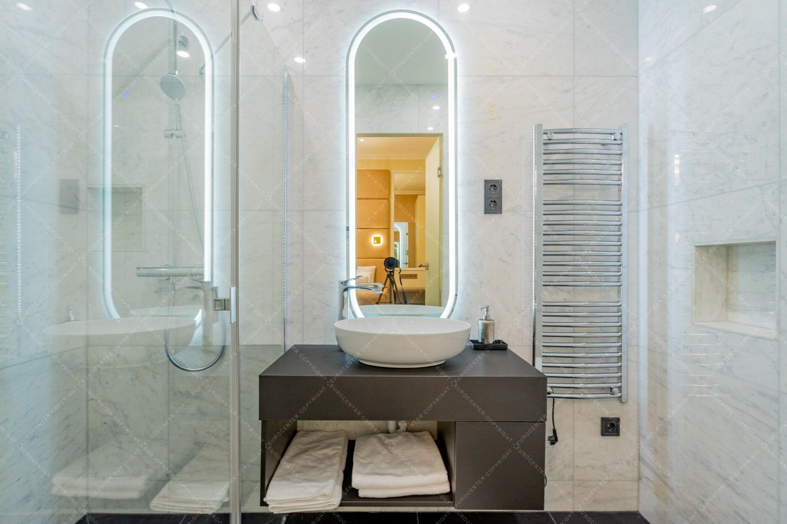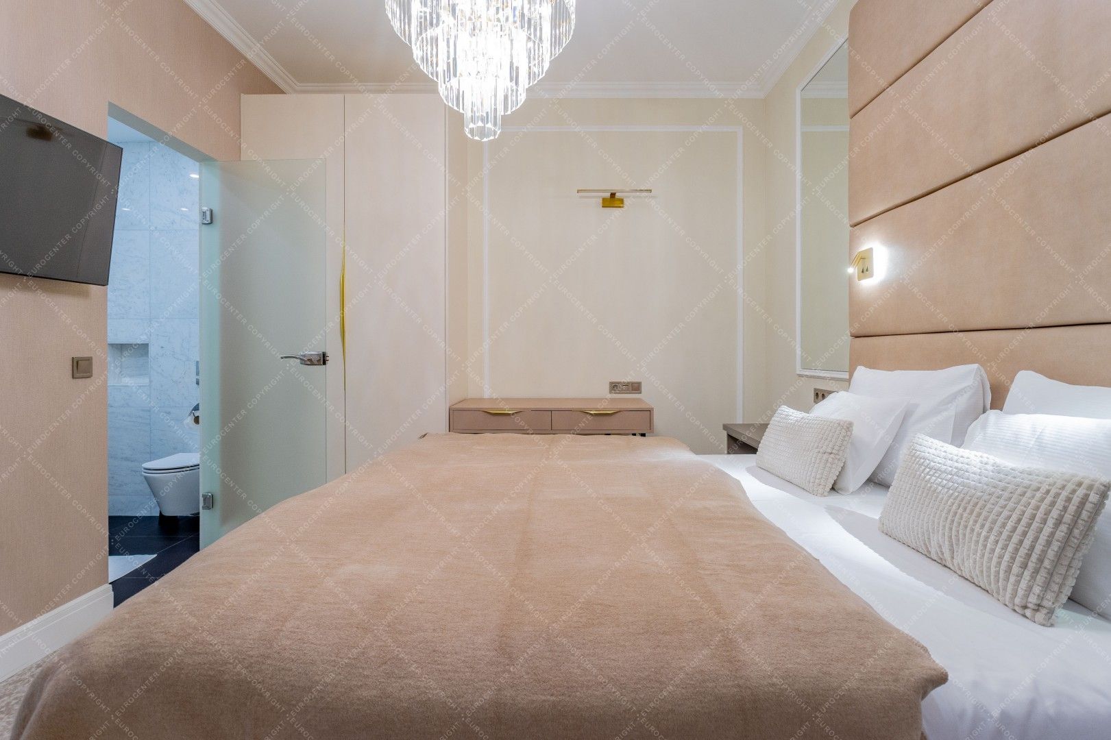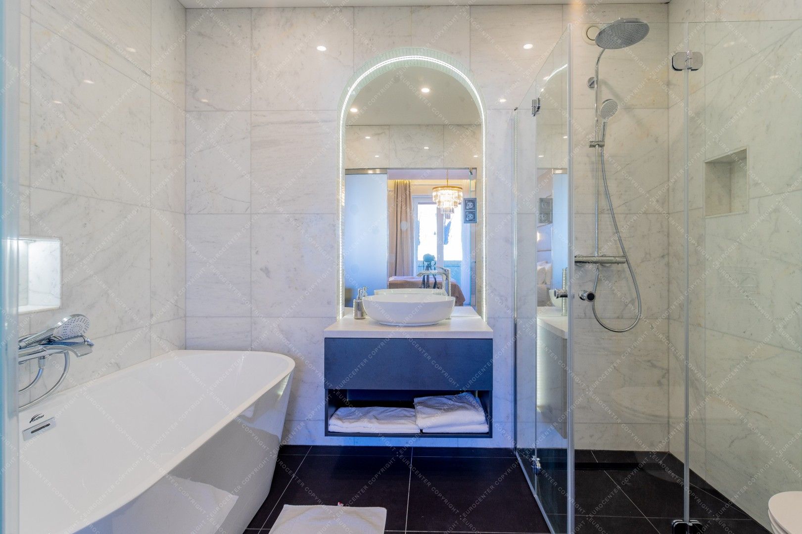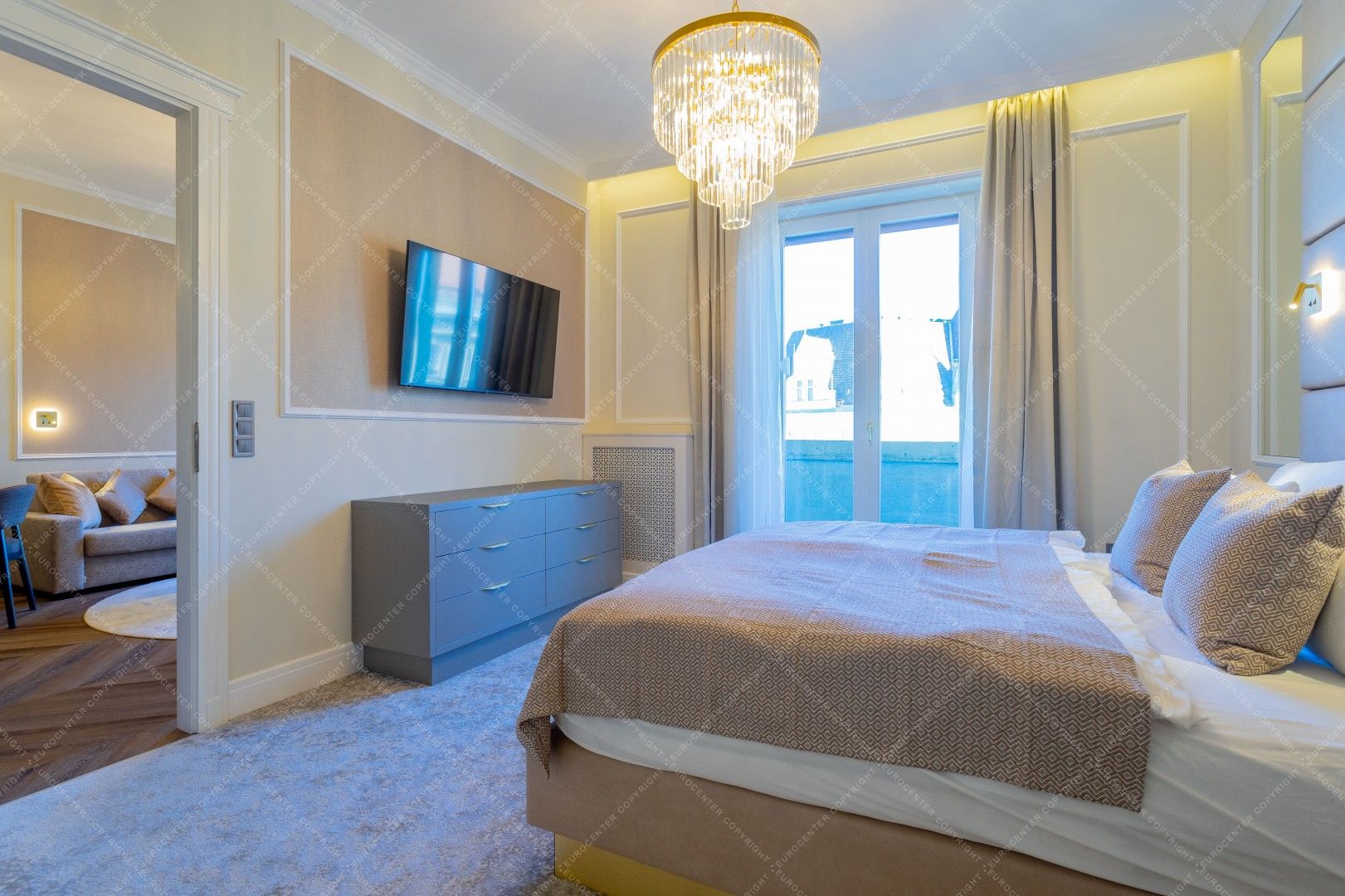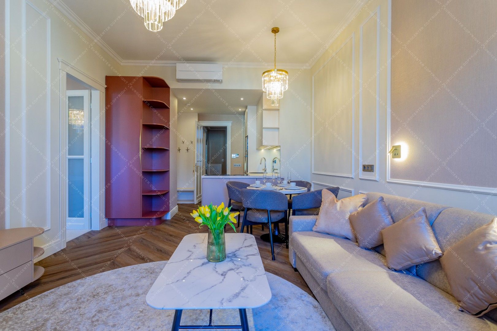 The apartment features a practical layout with 2 bedrooms with double beds, 2 bathrooms (one with bathtub and shower, one with bathtub), an open-plan living room with kitchen, and a separate kitchen for the main bedroom, providing comfort and privacy. Renovated with high-quality materials, the apartment offers a modern, elegant living space.