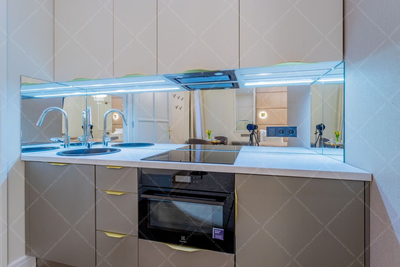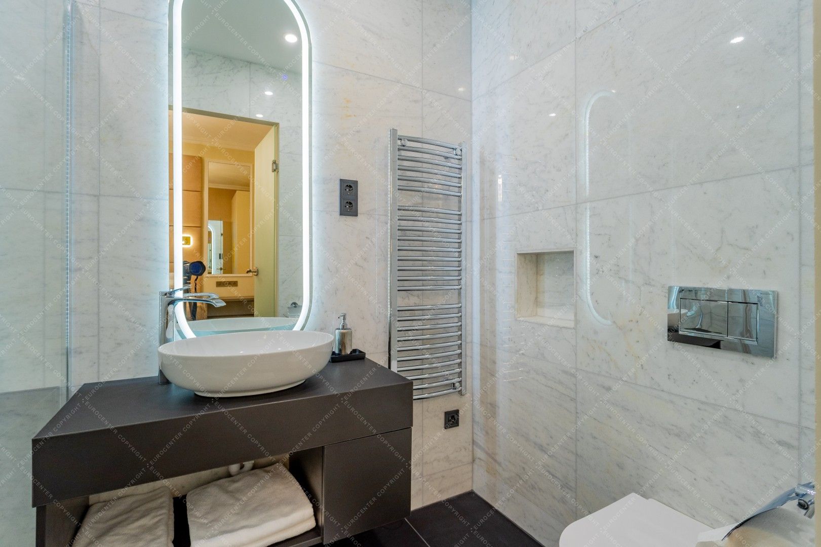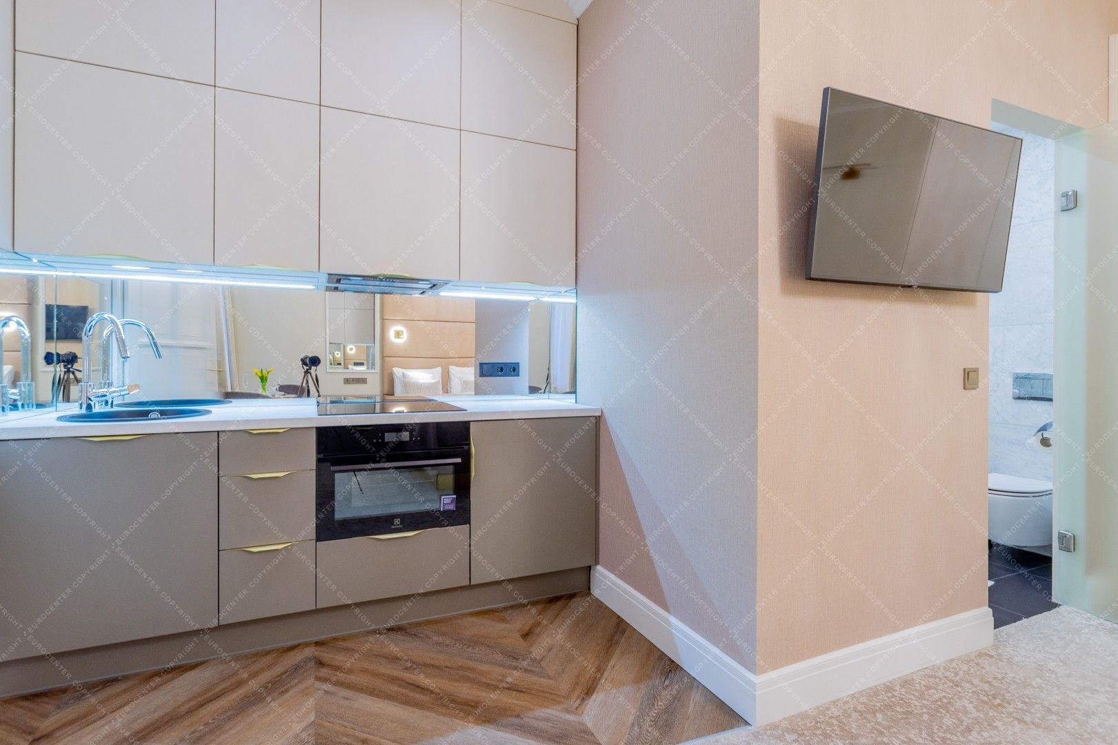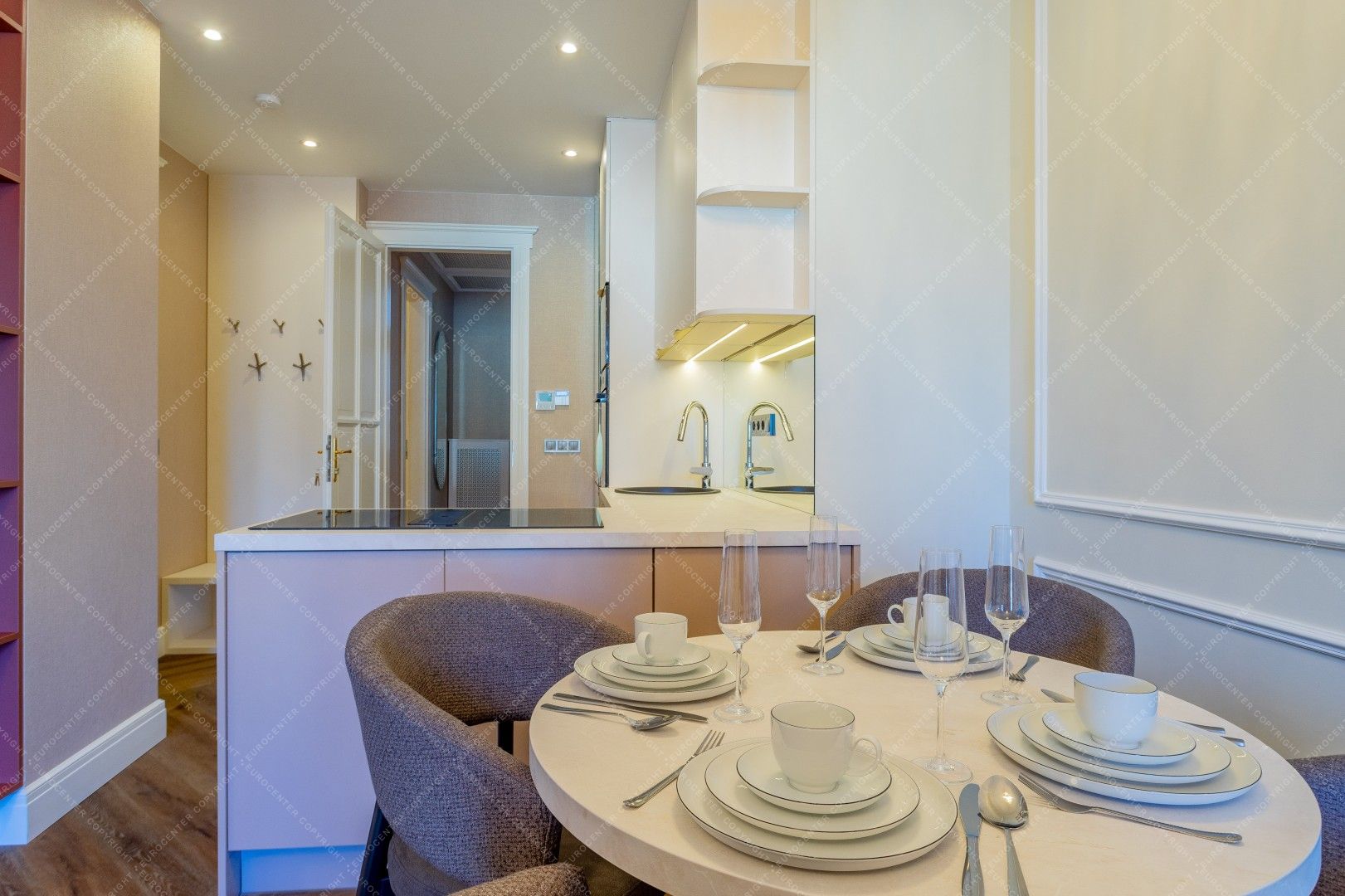 The apartment features a practical layout with 2 bedrooms with double beds, 2 bathrooms (one with bathtub and shower, one with bathtub), an open-plan living room with kitchen, and a separate kitchen for the main bedroom, providing comfort and privacy. Renovated with high-quality materials, the apartment offers a modern, elegant living space.