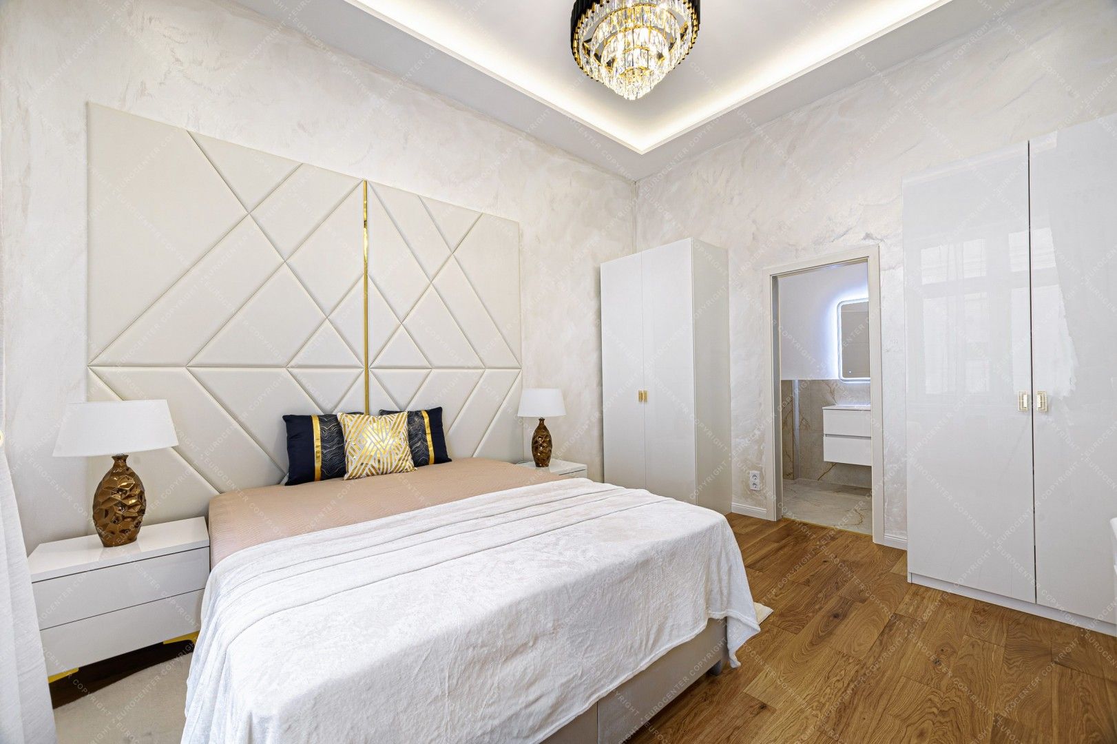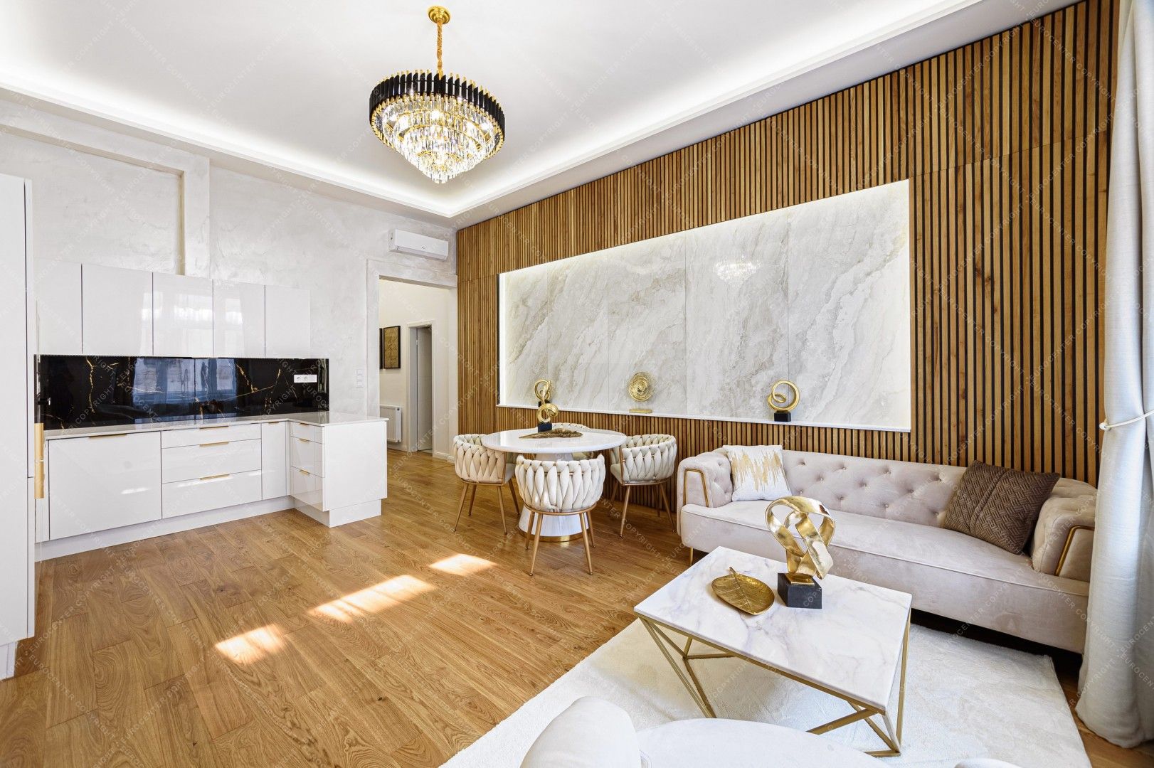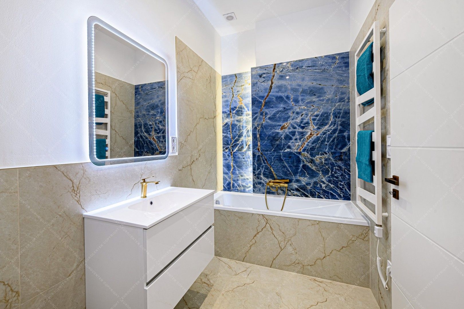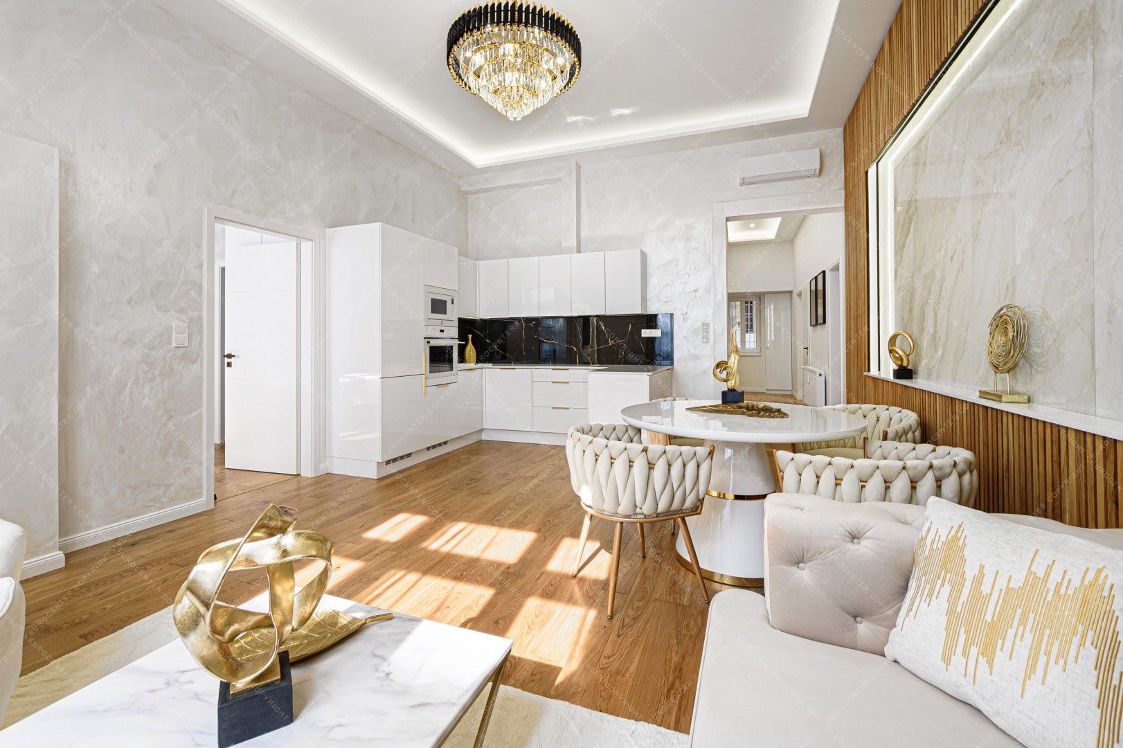 The apartment has: 2 bedrooms, living room with American kitchen, 2 bathrooms, separate toilet and a hall.