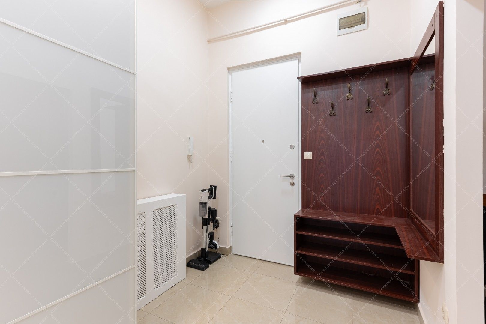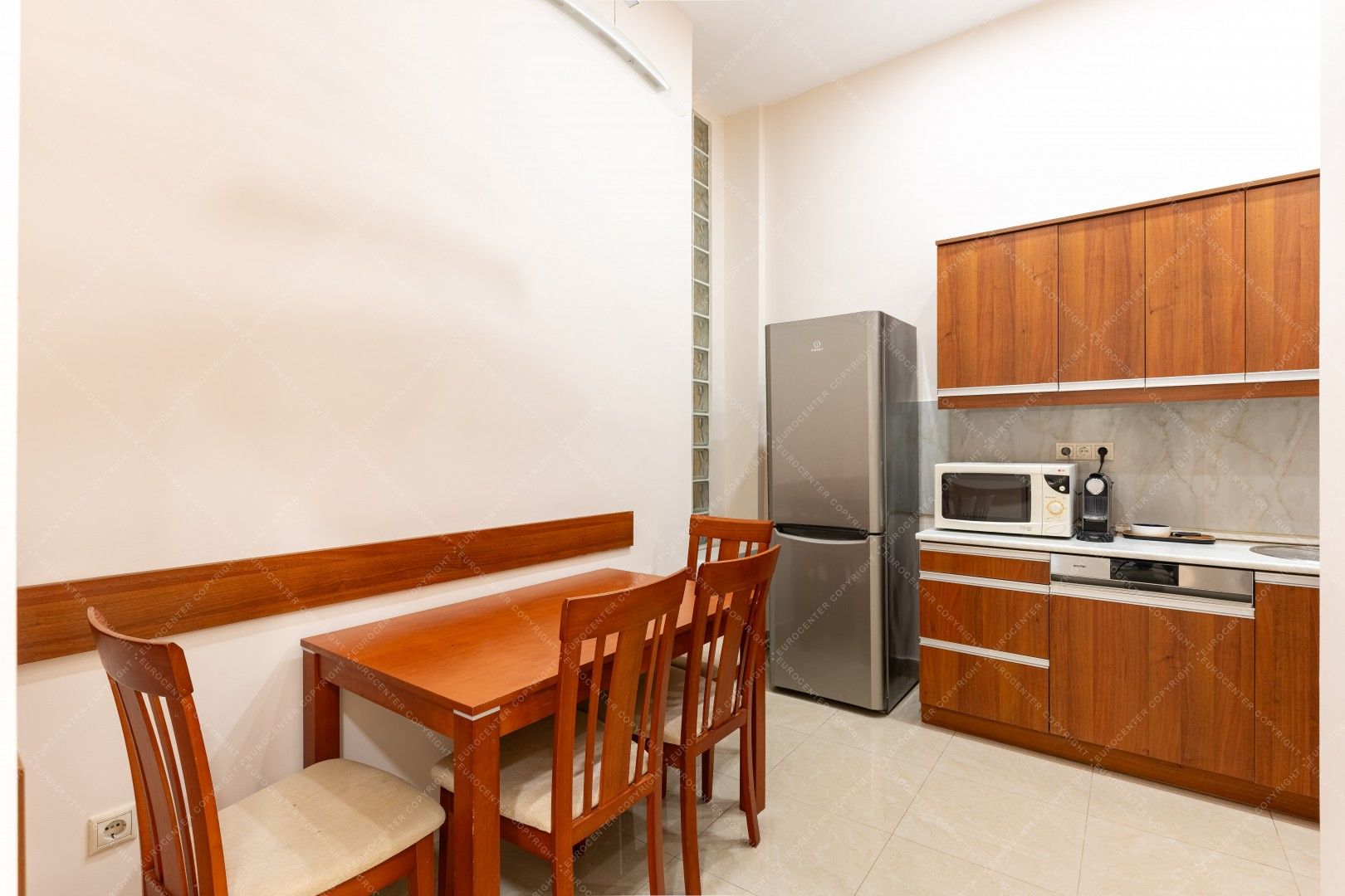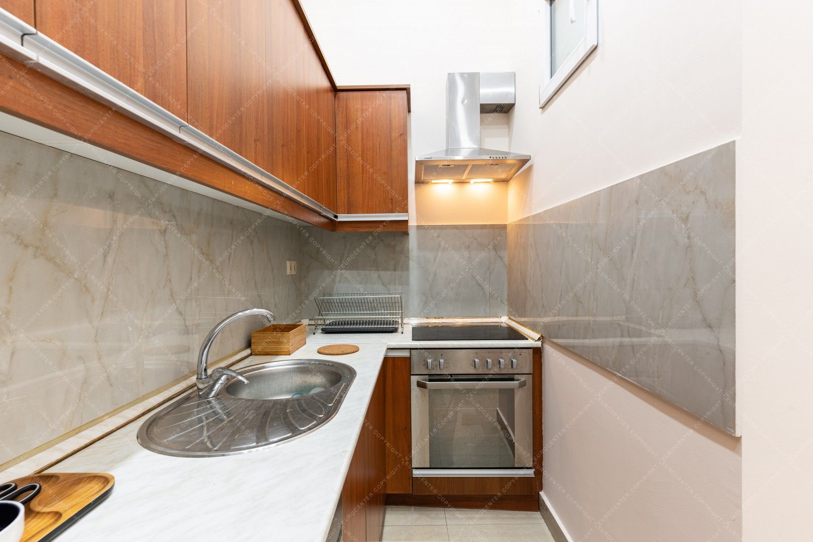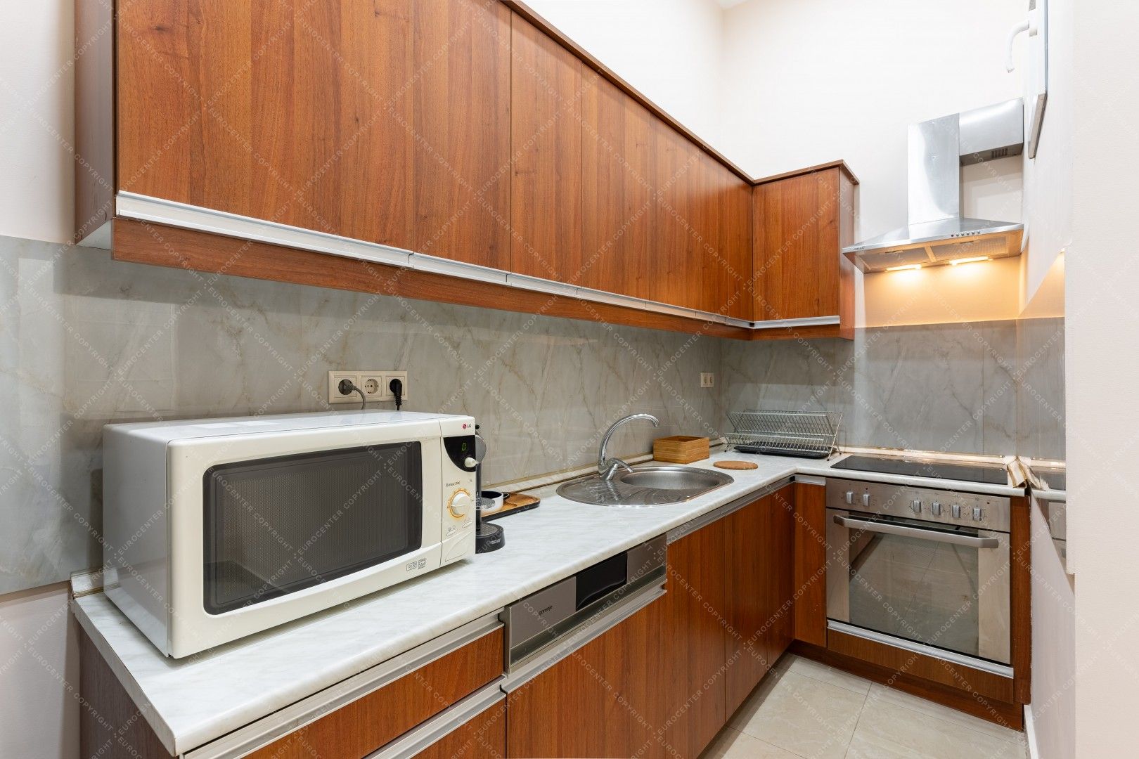 The apartment offers a well-designed layout including one bedroom, a spacious living room, a separate fully equipped kitchen, and a bathroom. It comes fully furnished and equipped, having been renovated to a significantly higher-than-average standard, with attention to quality materials and elegant details throughout.