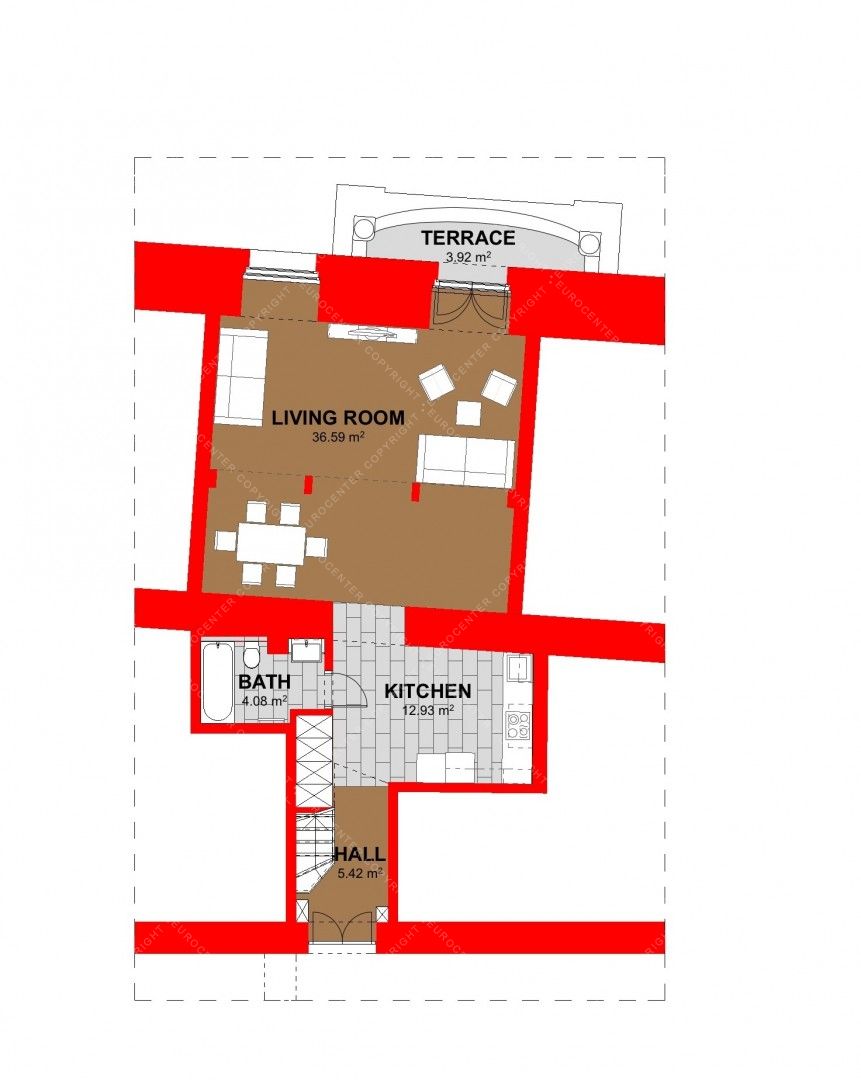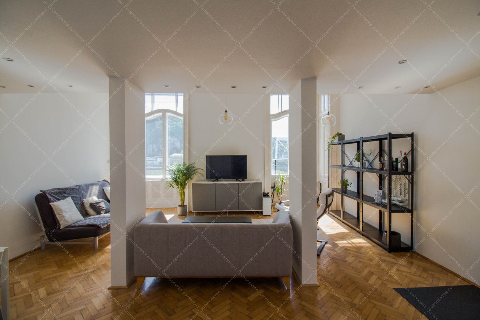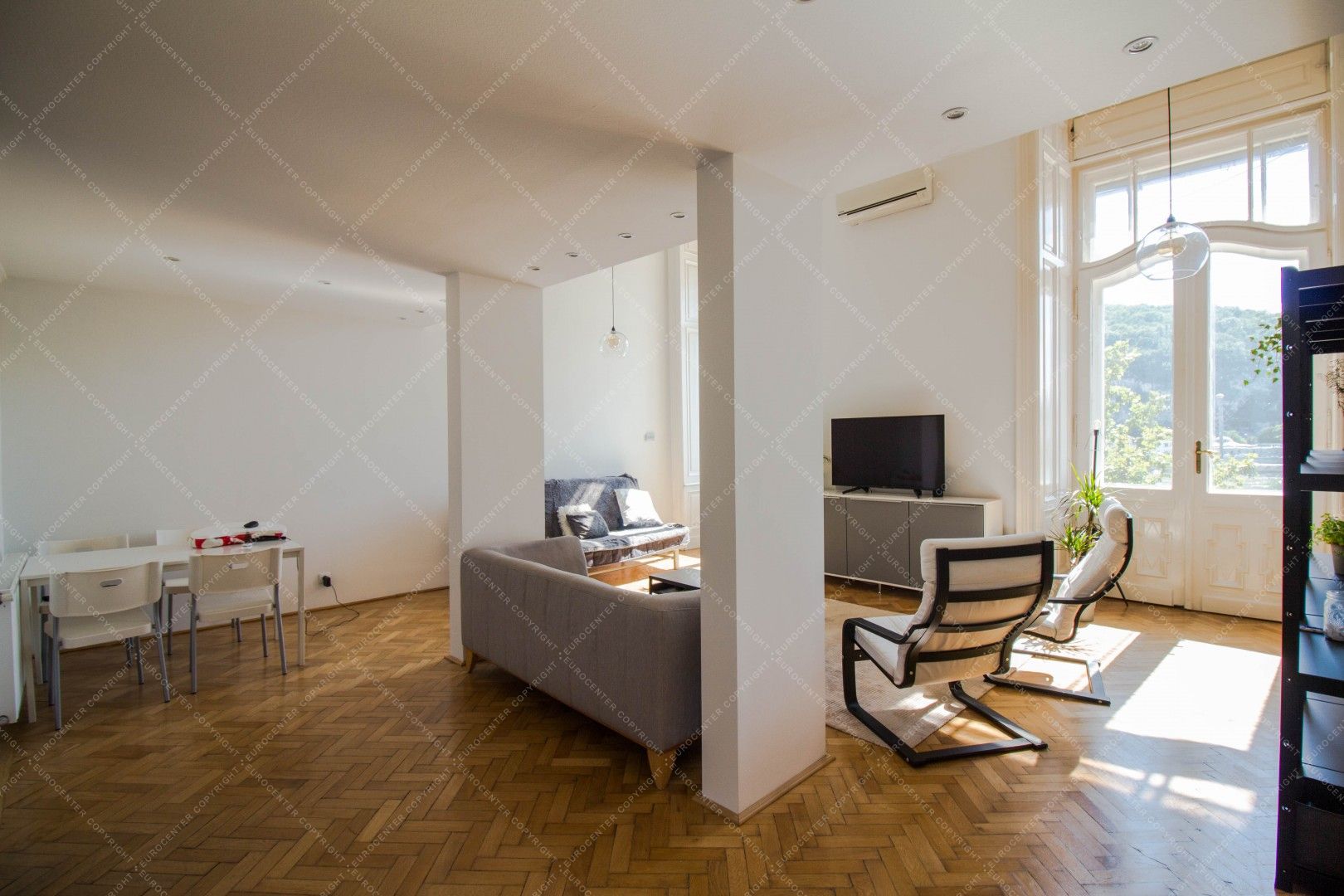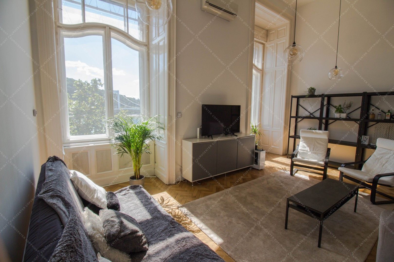 We offer for rent a 97,5 sqm (59 sqm ground floor + 35 sqm first floor + 3,5 sqm balcony) furnished luxury apartment in district 5 in Belgrád rakpart. It is situated in a classical building on the 1st floor. The windows face the River Danube. The apartment is newly renovated. It consists of a living room, a kitchen, a wardobe, 1 bedroom, 1 bathroom, a utility room, a toilet and a balcony. Common cost is 20.000 HUF/month (water included).