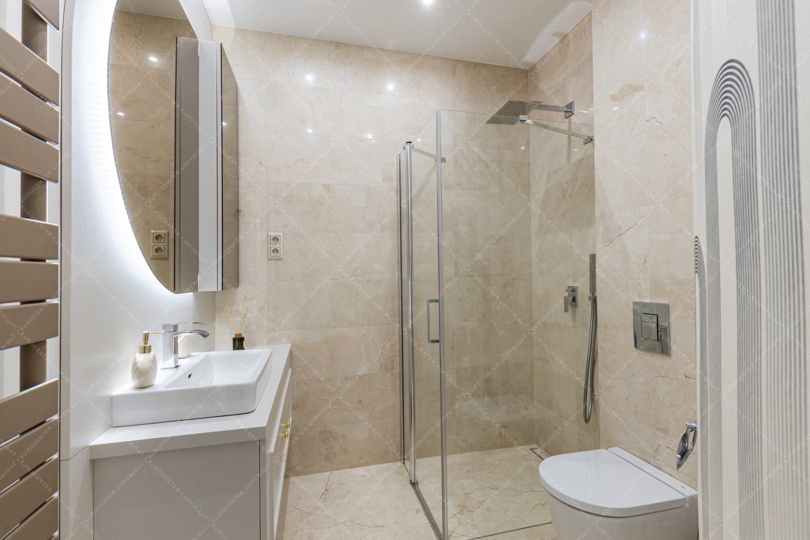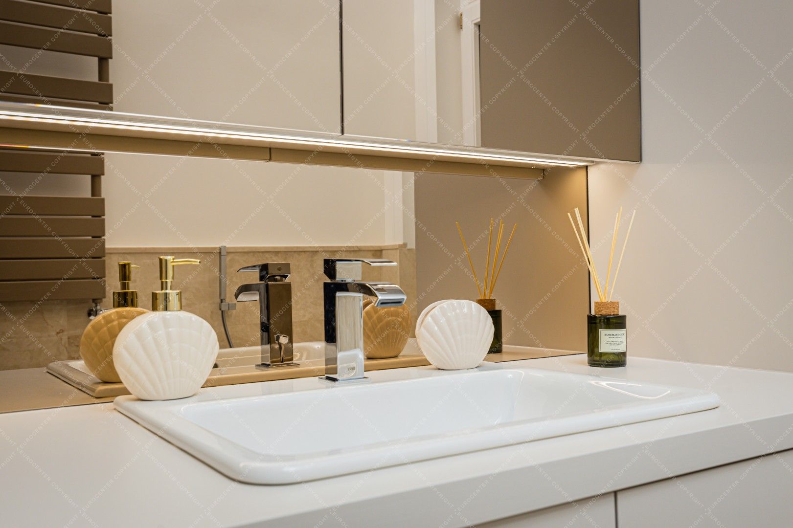 The 76 sqm property consists of a spacious living room with an American kitchen and two bedrooms, each with a bathroom with a shower and a bathtub.