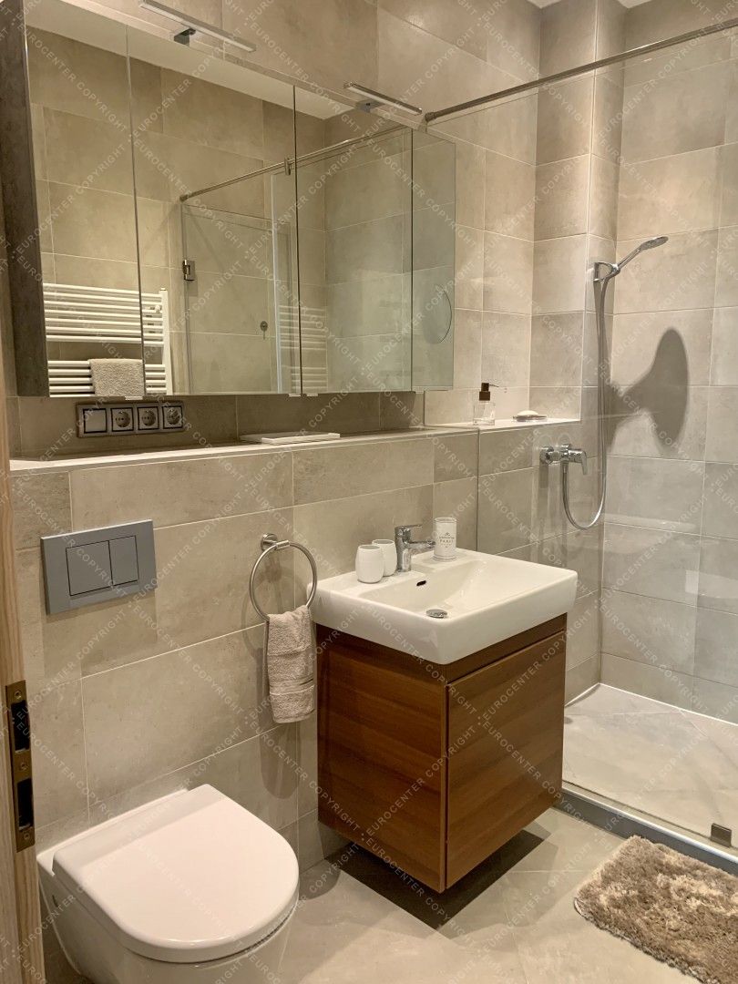 The total surface is 90 sqm, it has 2 bedrooms, a bathroom with shower, fully mechanized kitchen, and you can enter to the balcony from the living room. The view is beautiful, you can see the Square, and the Danube as well.