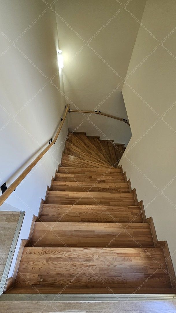 The 137 sqm apartment has a spacious bedroom, separate bathroom and toilet, and a storage room on the lower level, while the upper level has three bedrooms, a living room-kitchen with built-in furniture, a bathroom, and two separate terraces. All rooms have mosquito nets and roller blinds on the windows. Heating and cooling are provided by fan coils in every room.