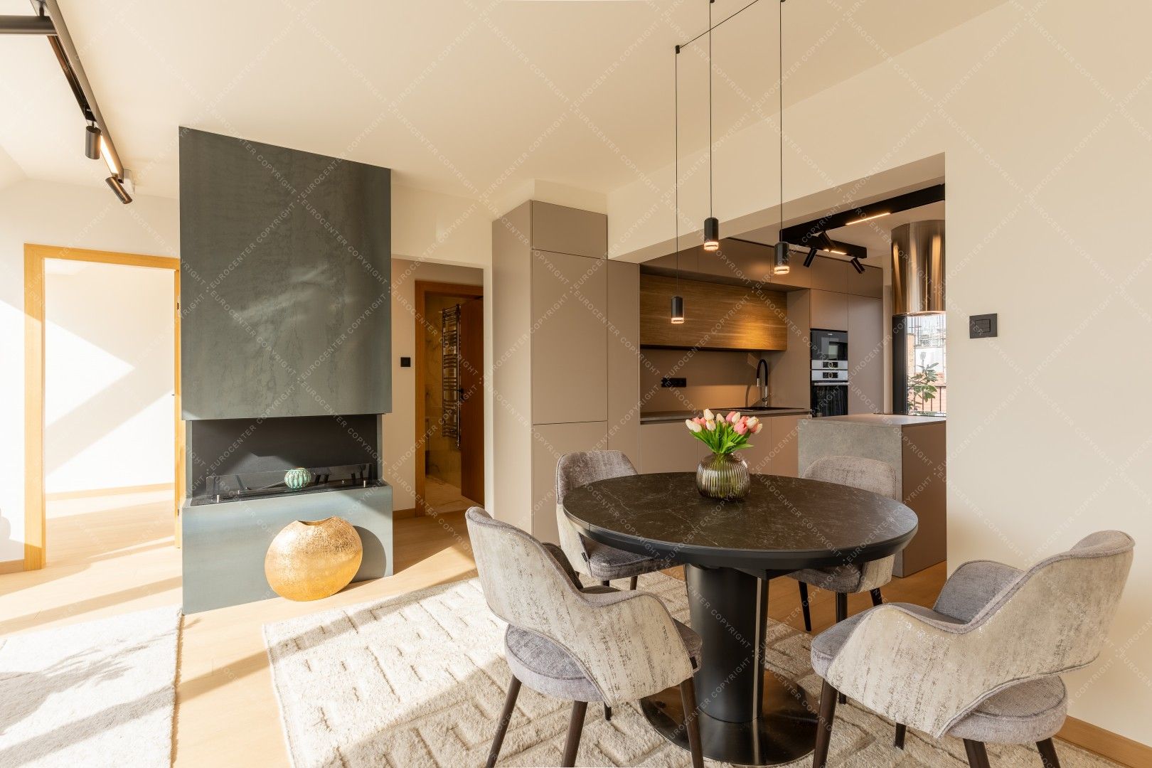 A lakáshoz egy nappali, konyha-étkező, két hálószoba, egy fürdő, egy 14 nm-es terasz és egy 60 nm-es tetőterasz tartozik.