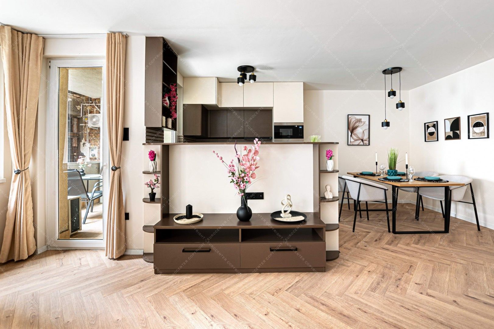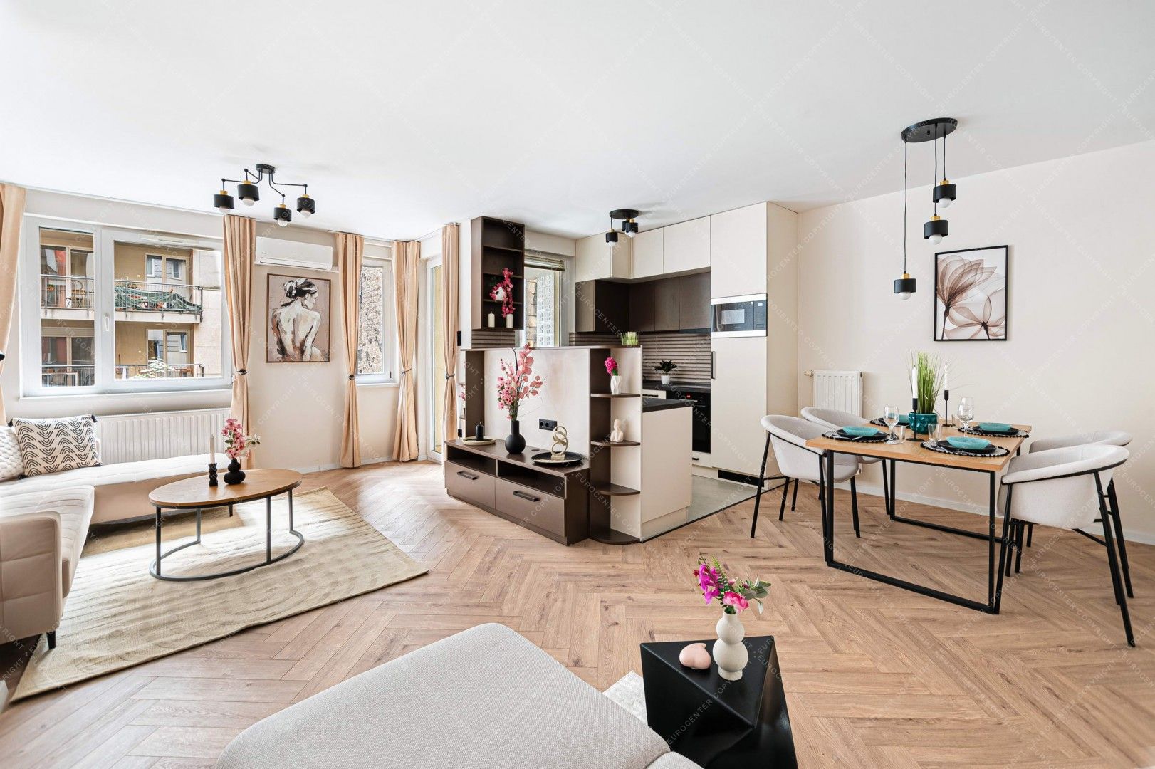 Az erkélykapcsolatos, napfényben úszó, tágas, 2.6 méter belmagasságú nappali-étkező lehetőséget biztosít a kikapcsolódásnak és összejöveteleknek is, ahol a hangulatot vadonatúj design lámpák biztosítják. A kényelmet egy modern, rendkívül halk hűtő-fűtő klíma is garantálja.