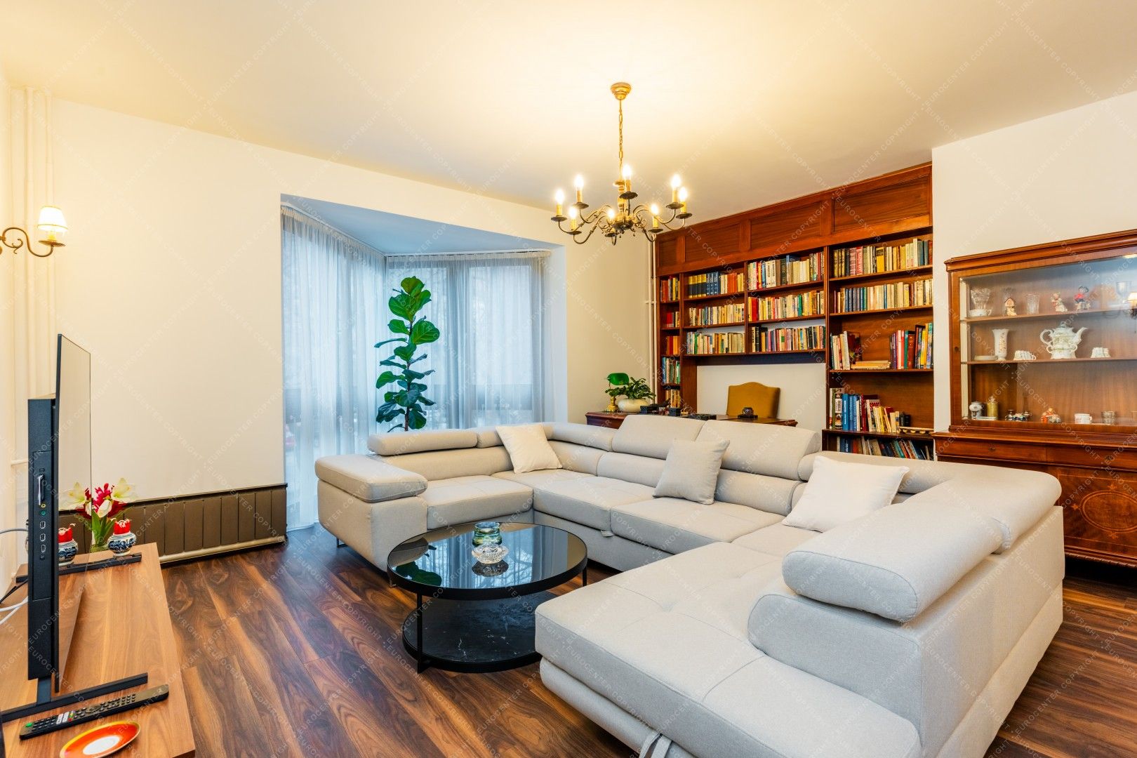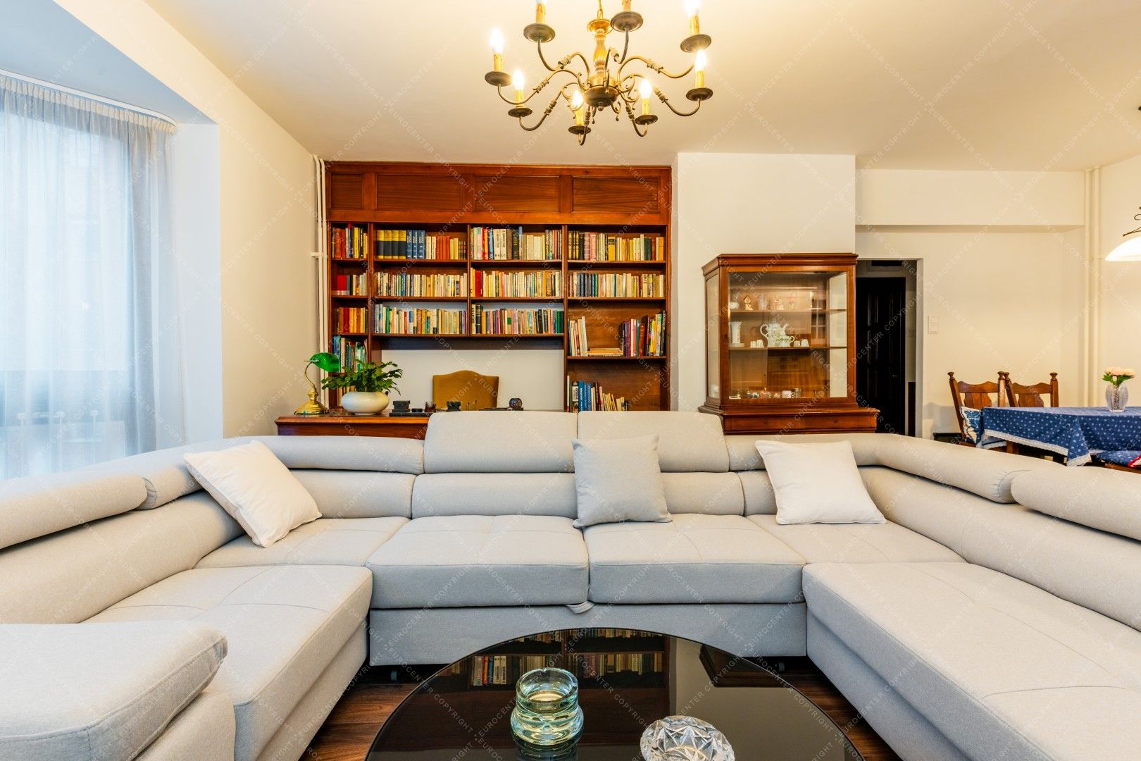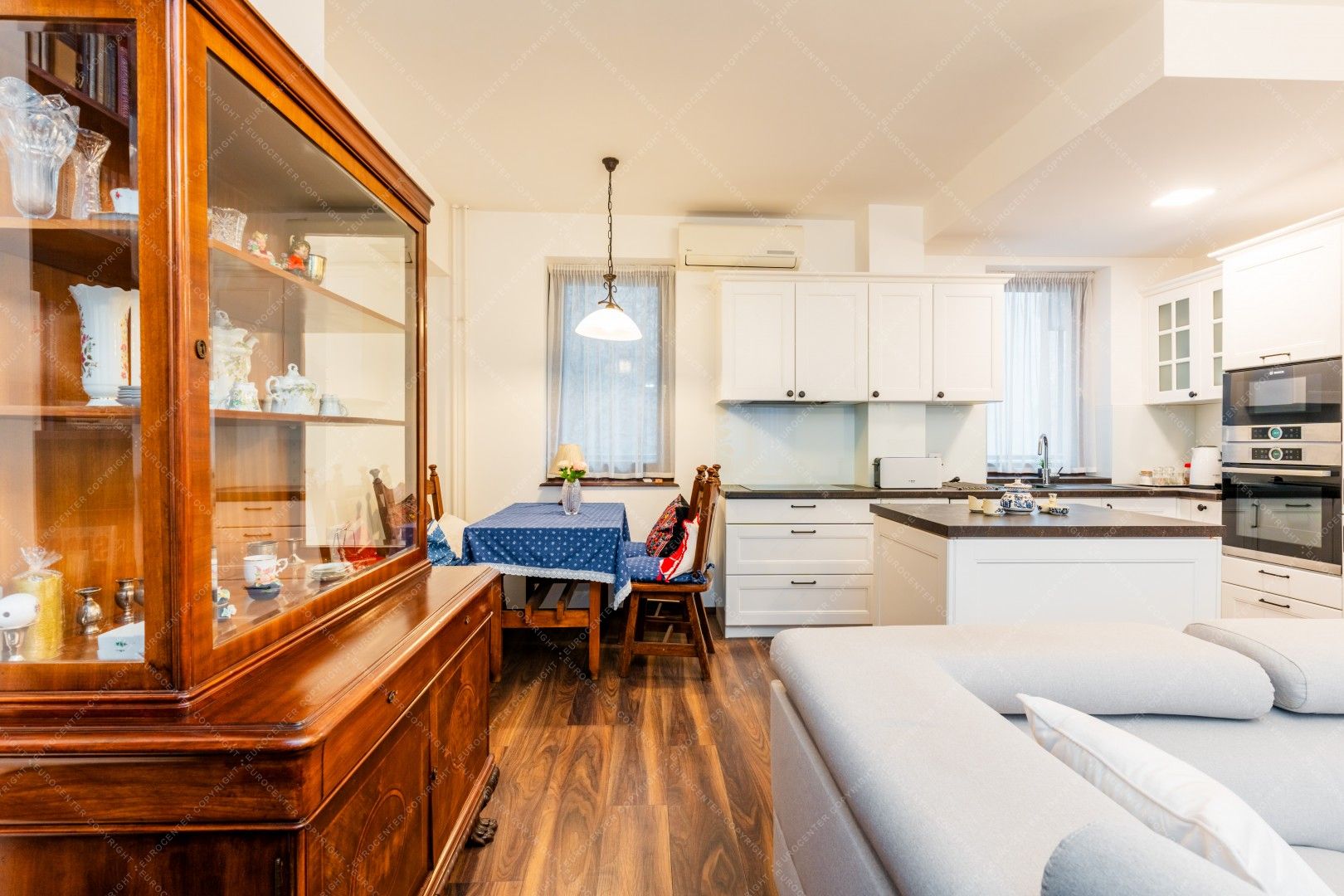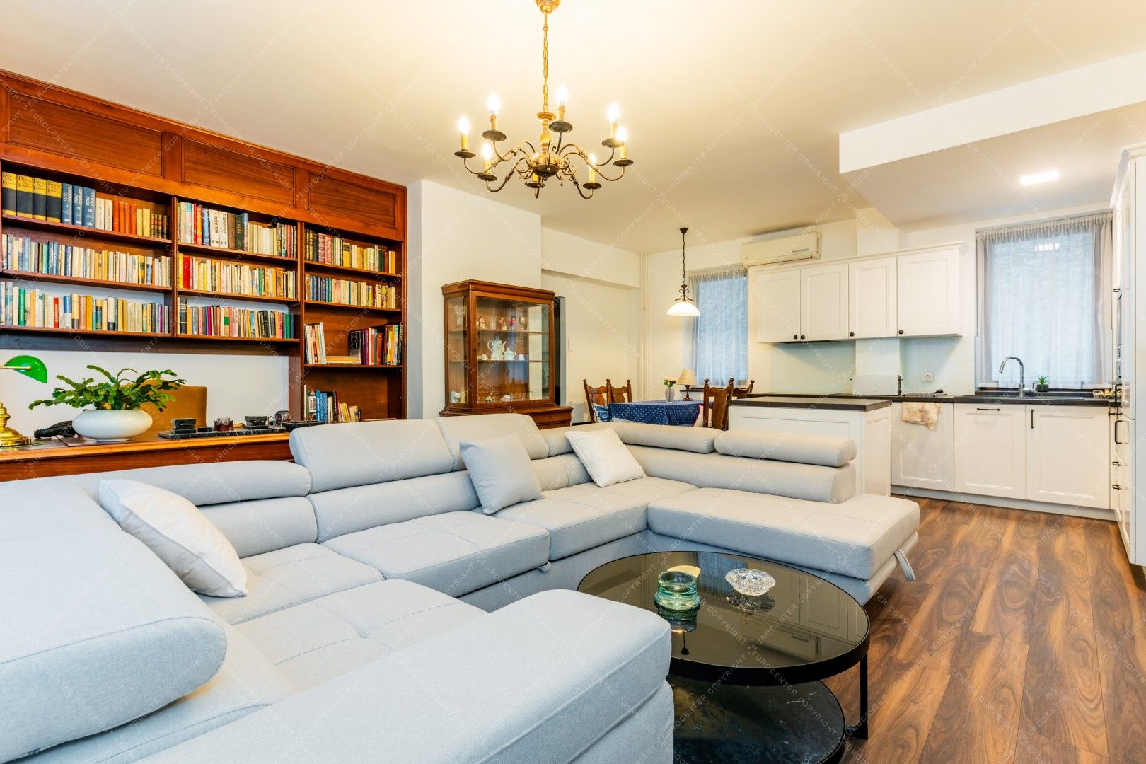 Tágas, világos nappali amerikai konyhával és étkező sarokkal