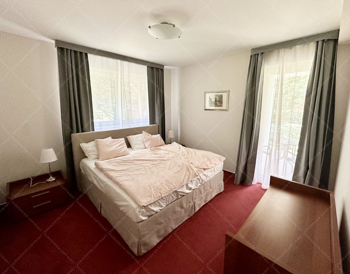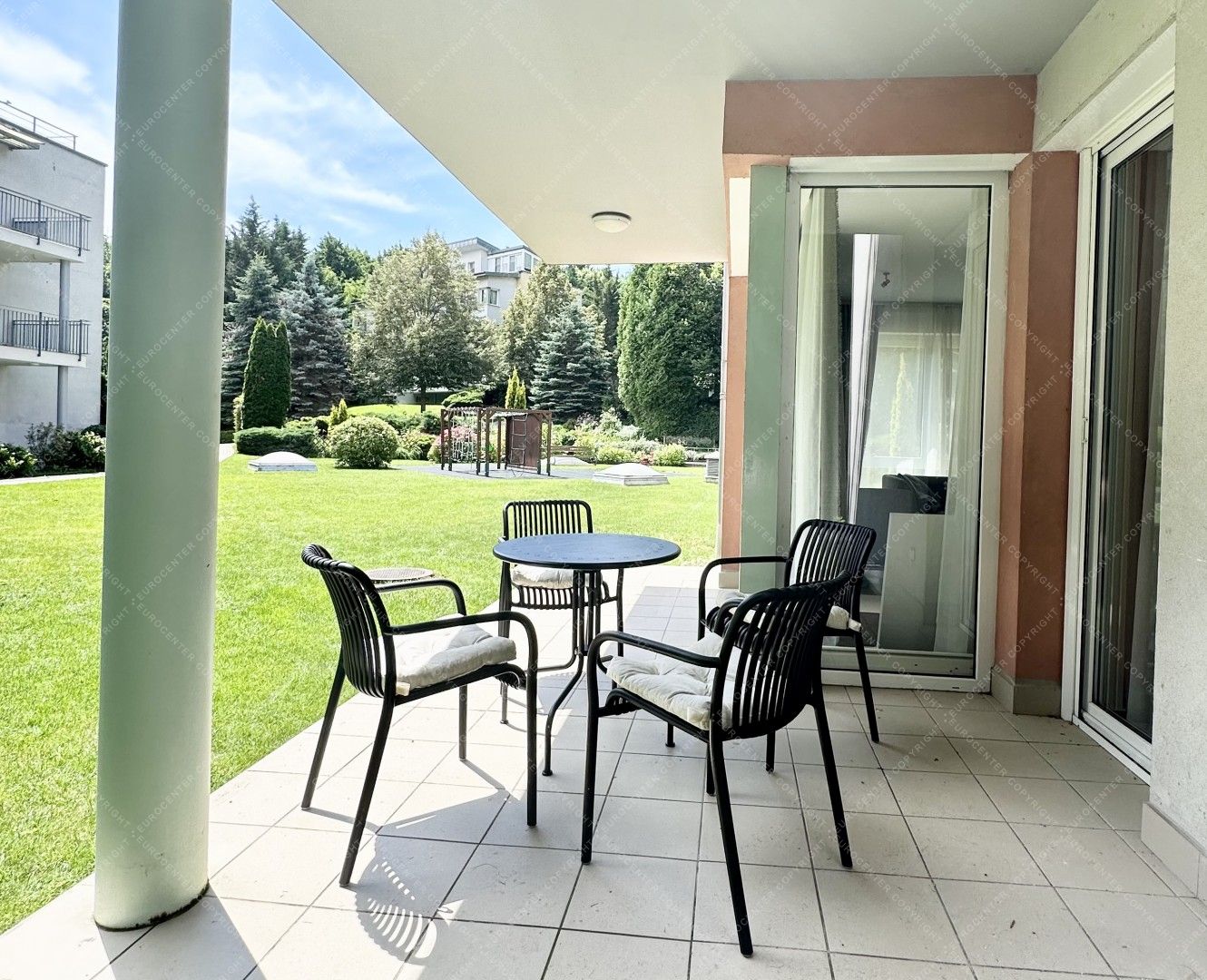 Részben bútorozott, földszinti, klímás lakás kiadó hosszú távra a Hárshegyi lakóparkban.