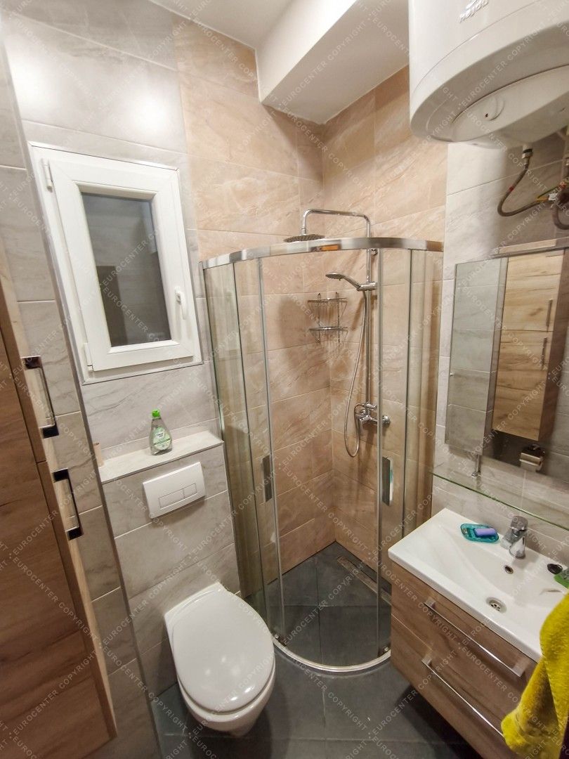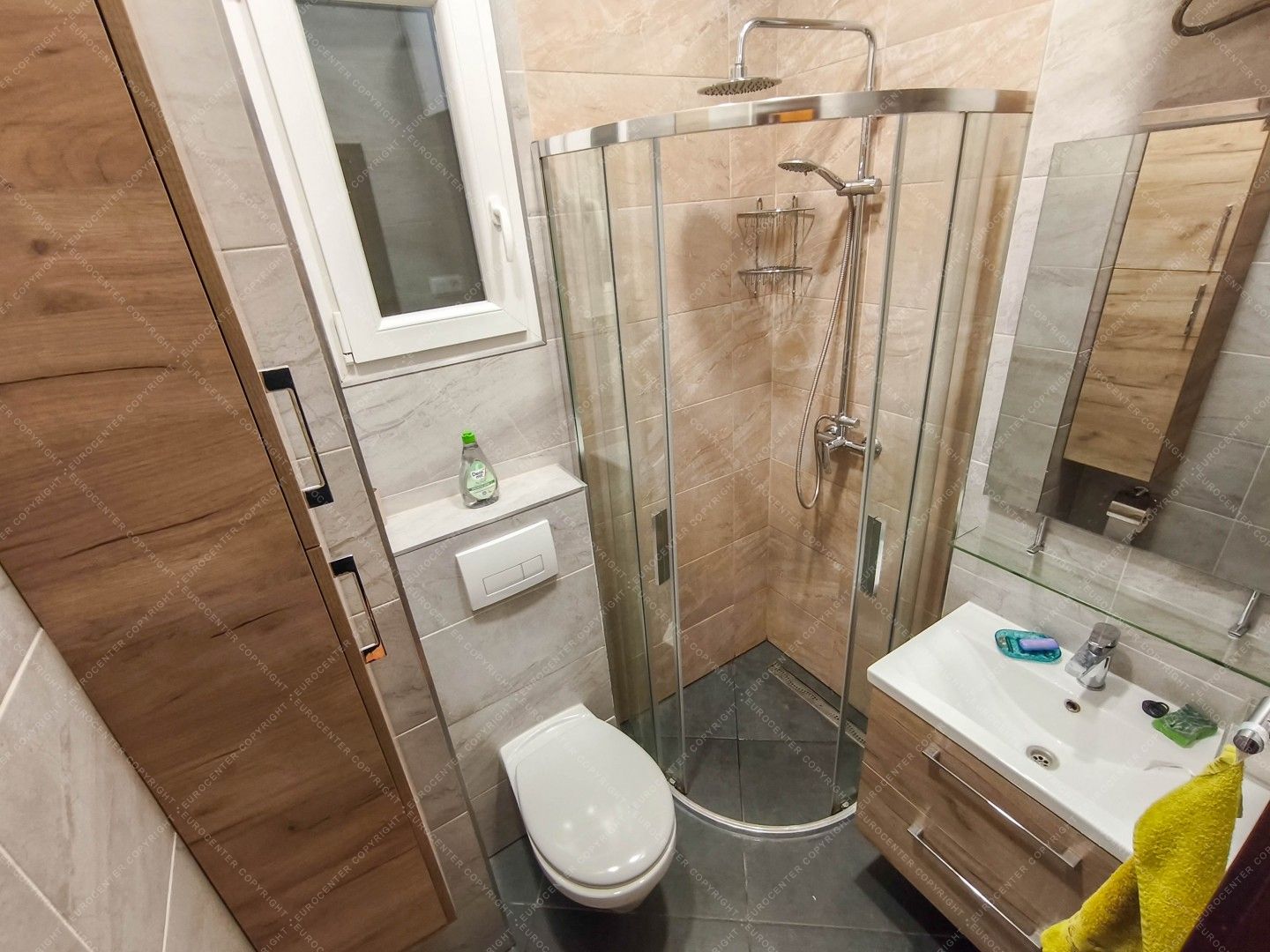 Mindkét fürdőszobában WC és mosdó van; az egyik zuhanyzós, a másik fürdőkádas.