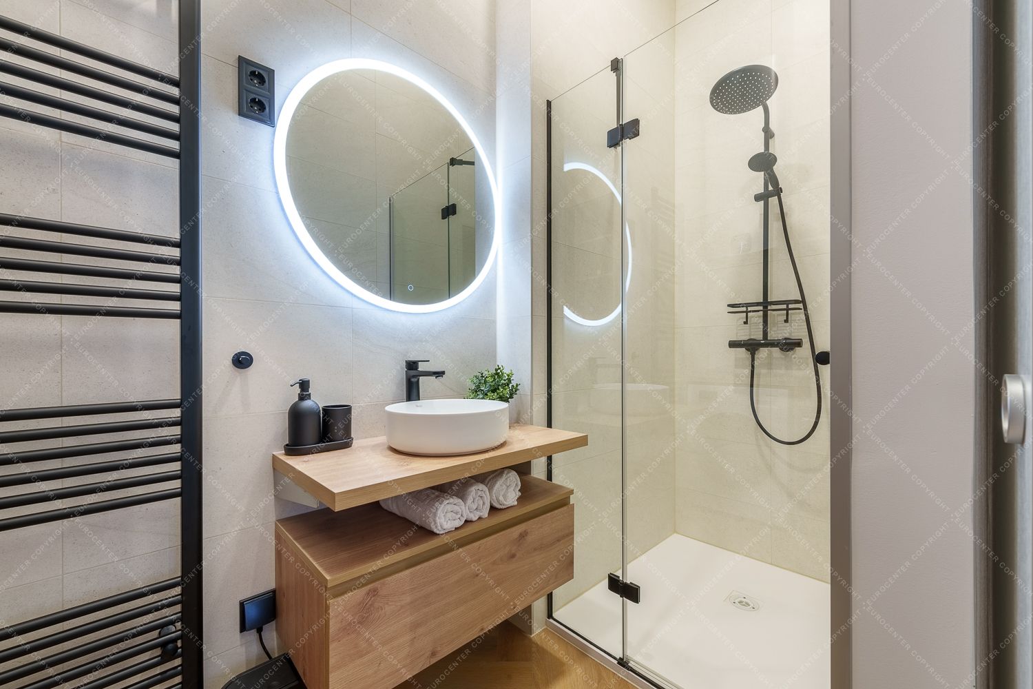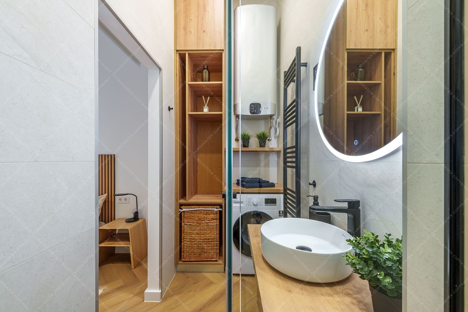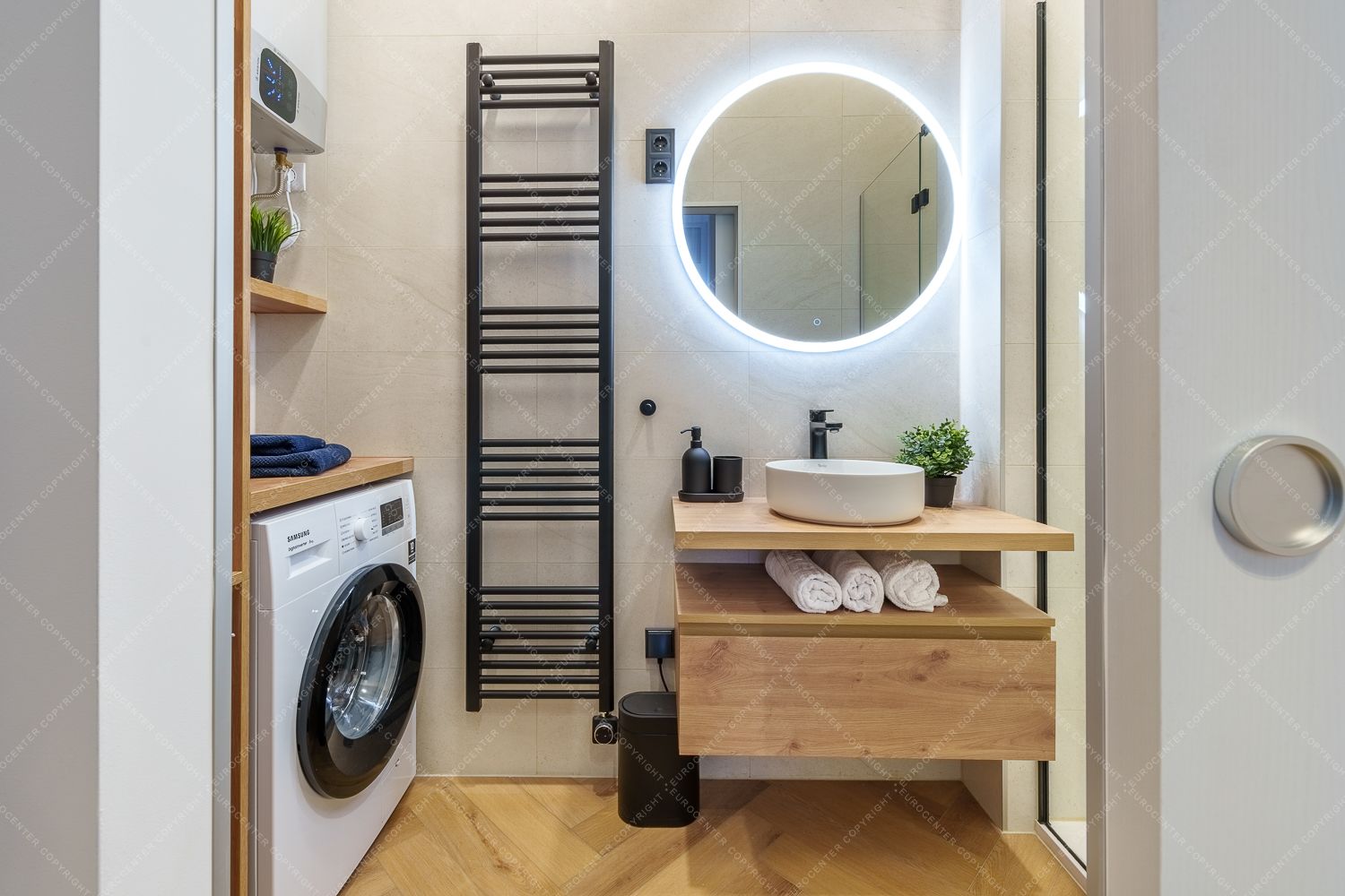 •Modern fürdőszoba mosógéppel és bőséges tárolóhellyel