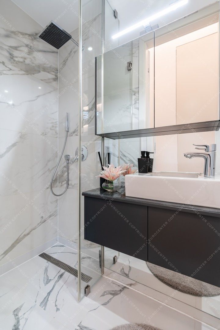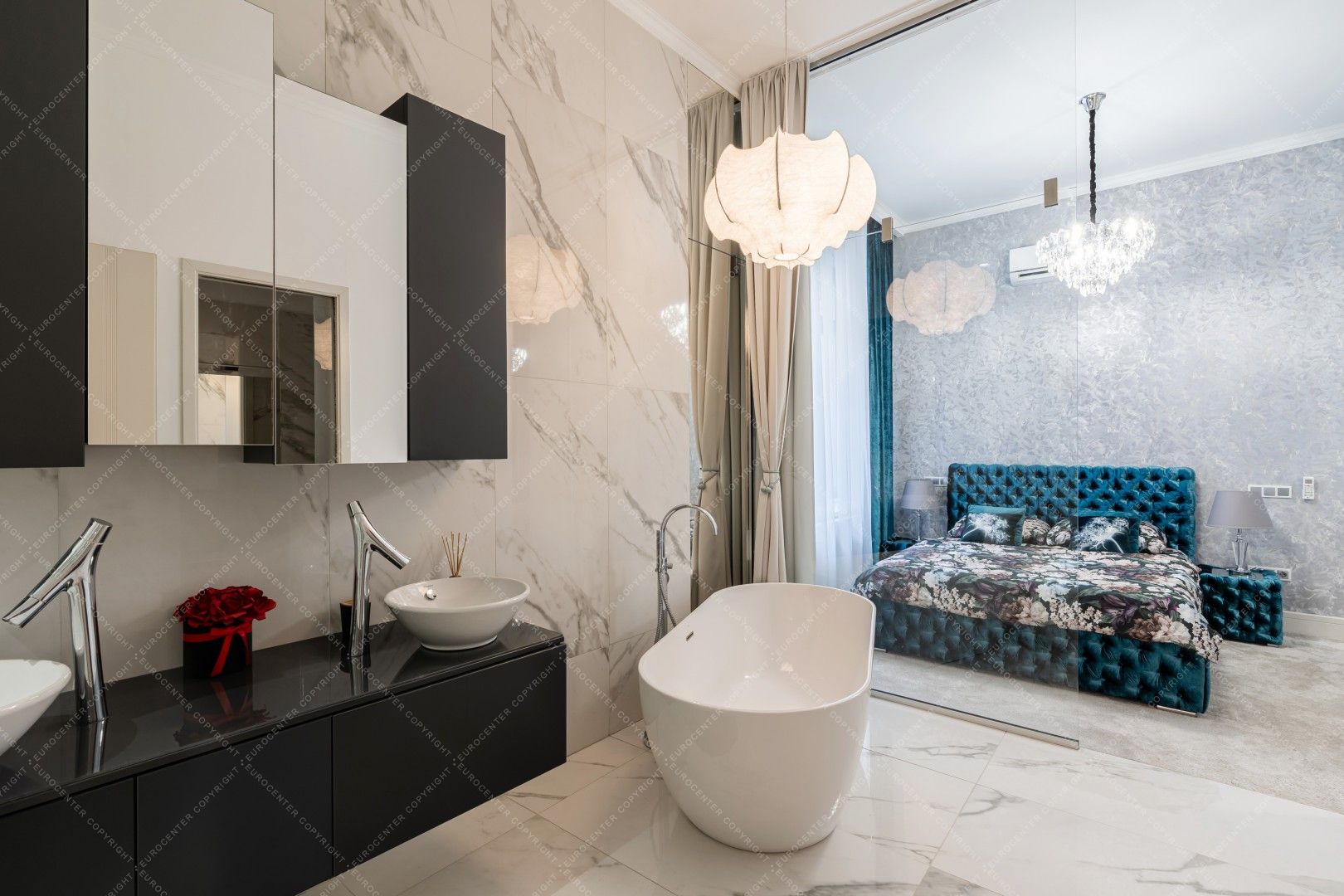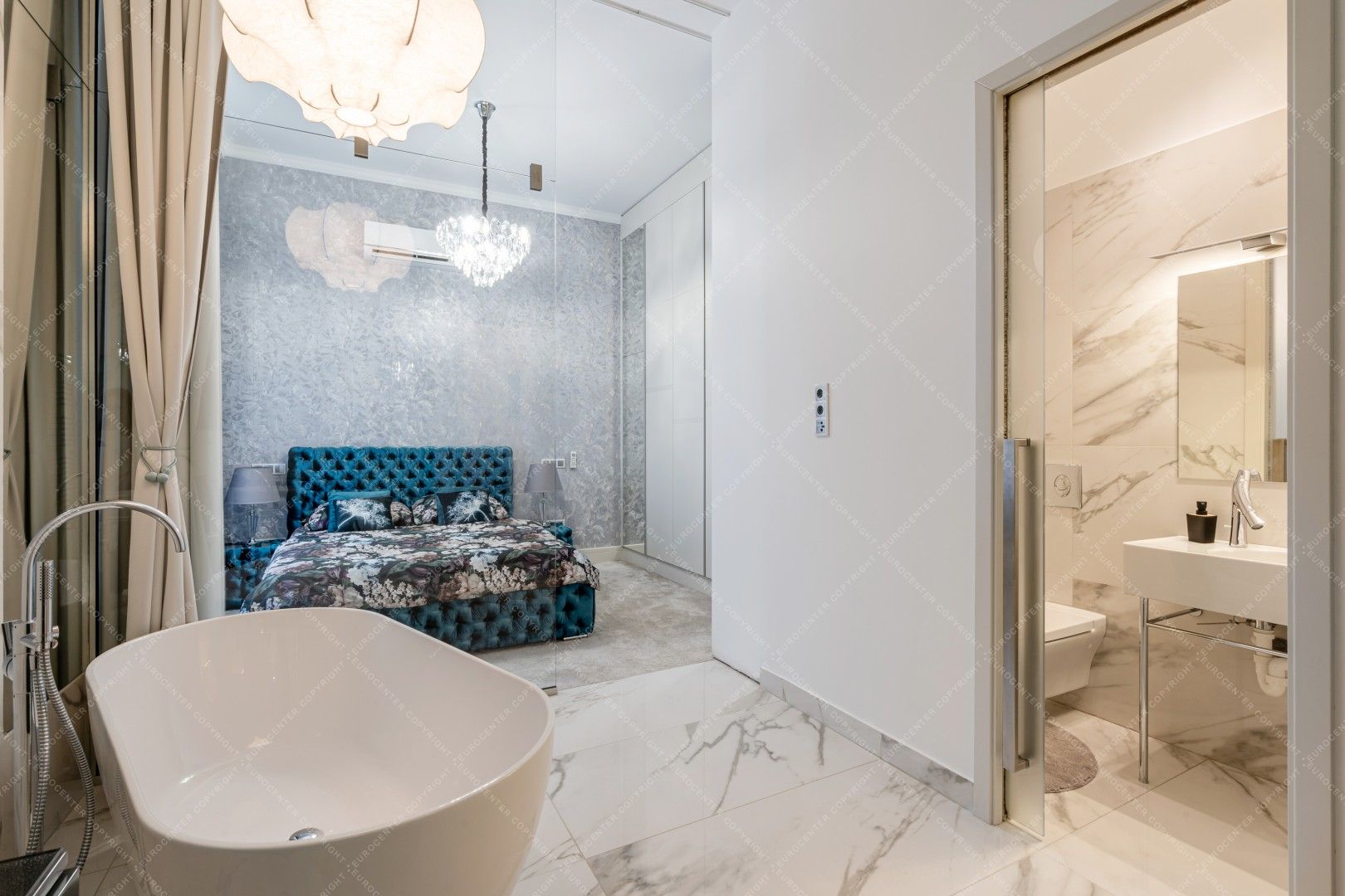 egy design fürdőszoba, amelyet üvegfal választ el az egyik hálószobától,