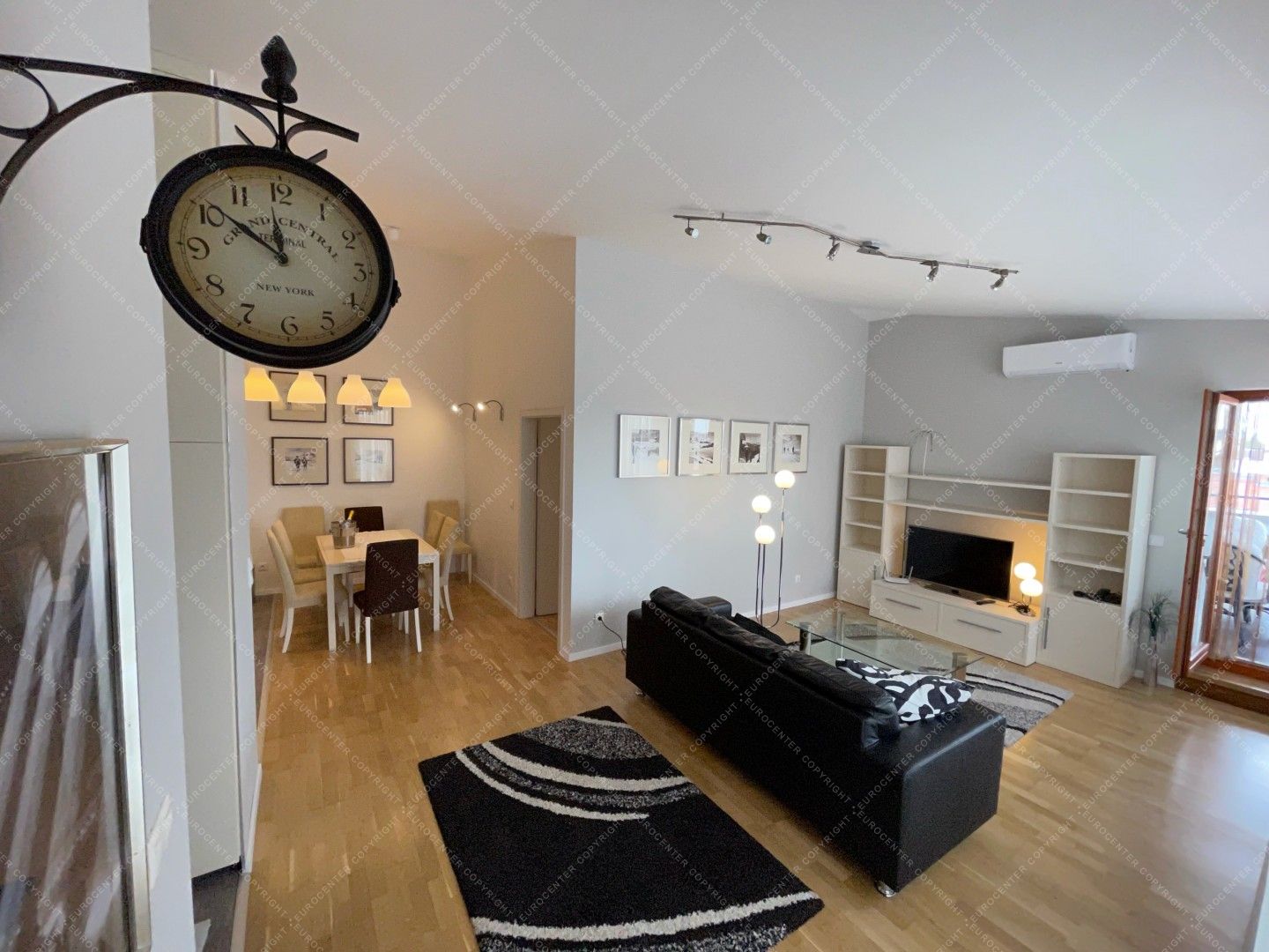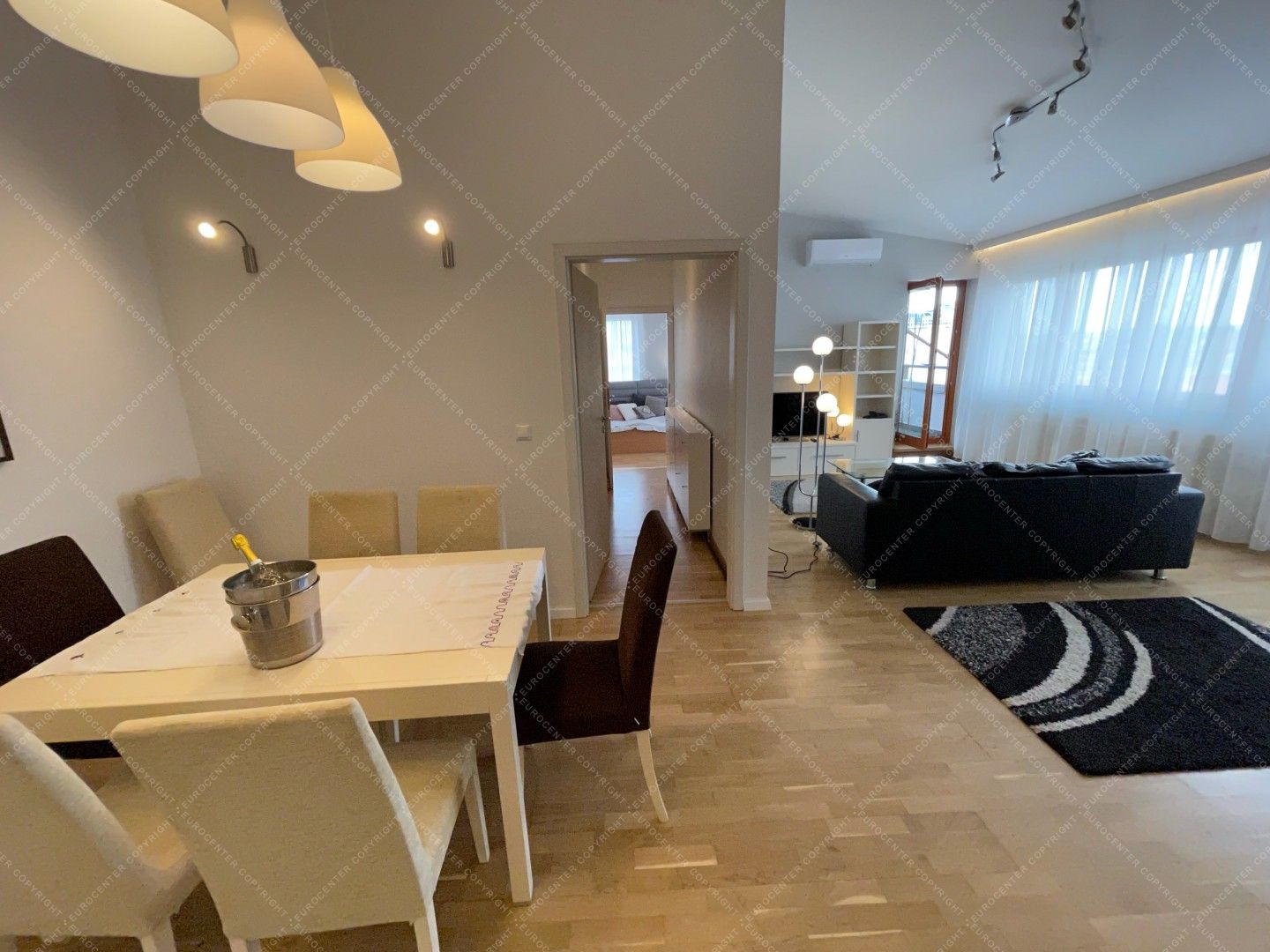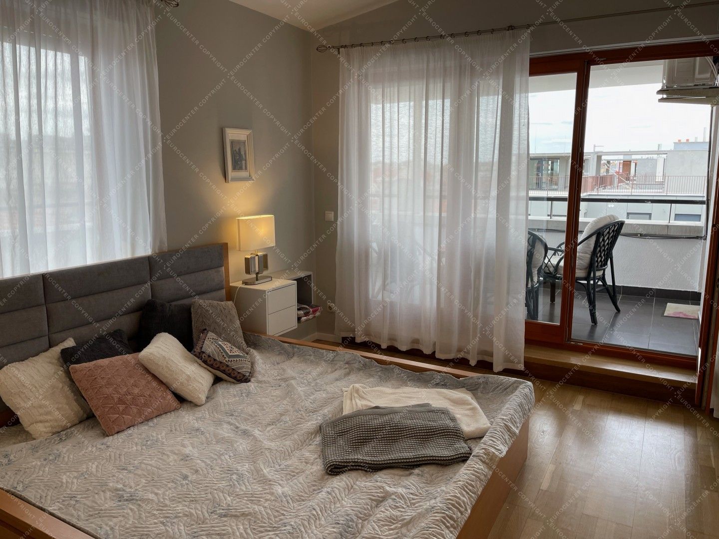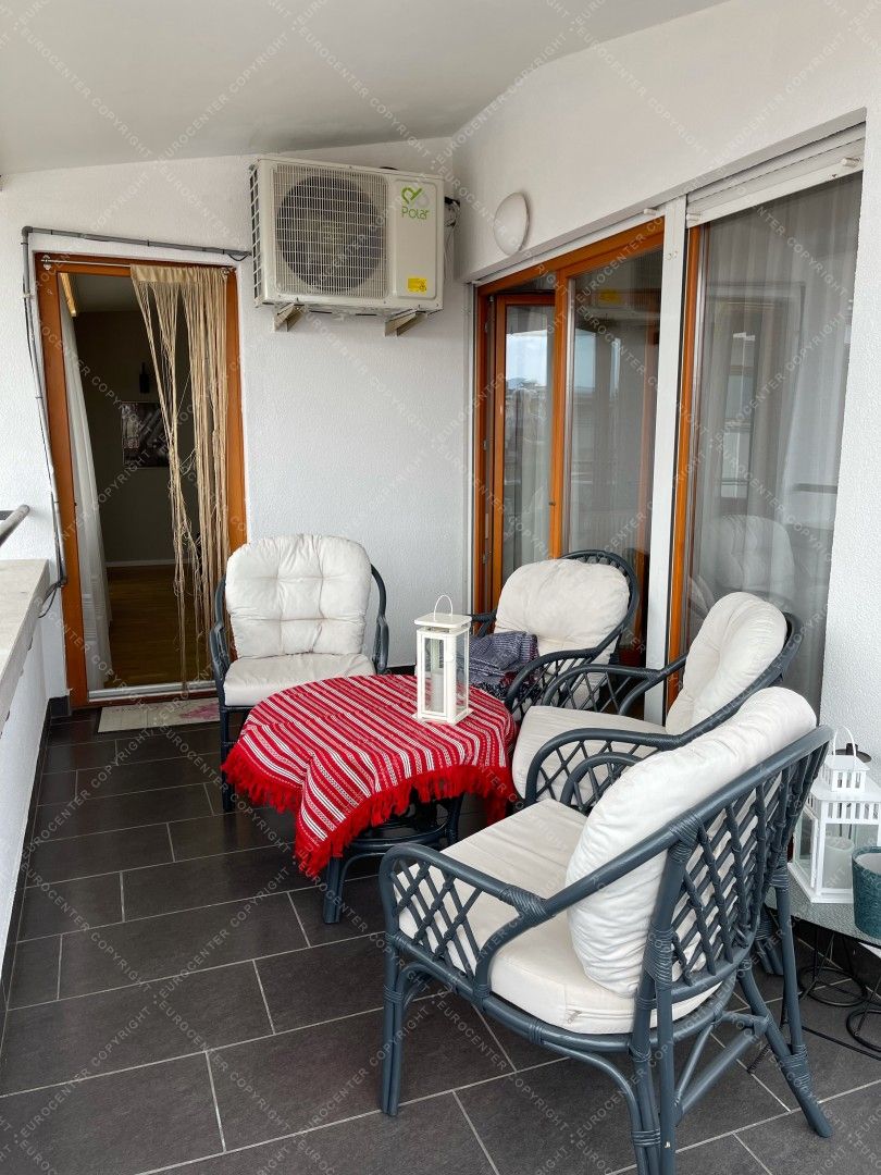 A modern, világos lakás 2 tágas hálószobából, egy nappaliból, egy felszerelt, szeparált konyhából, 2 fürdőszobából. 2 terasz (30 nm) és egy garázs szintén tartozik a légkondicionált ingatlanhoz. A házban 24 órás portaszolgálat működik.