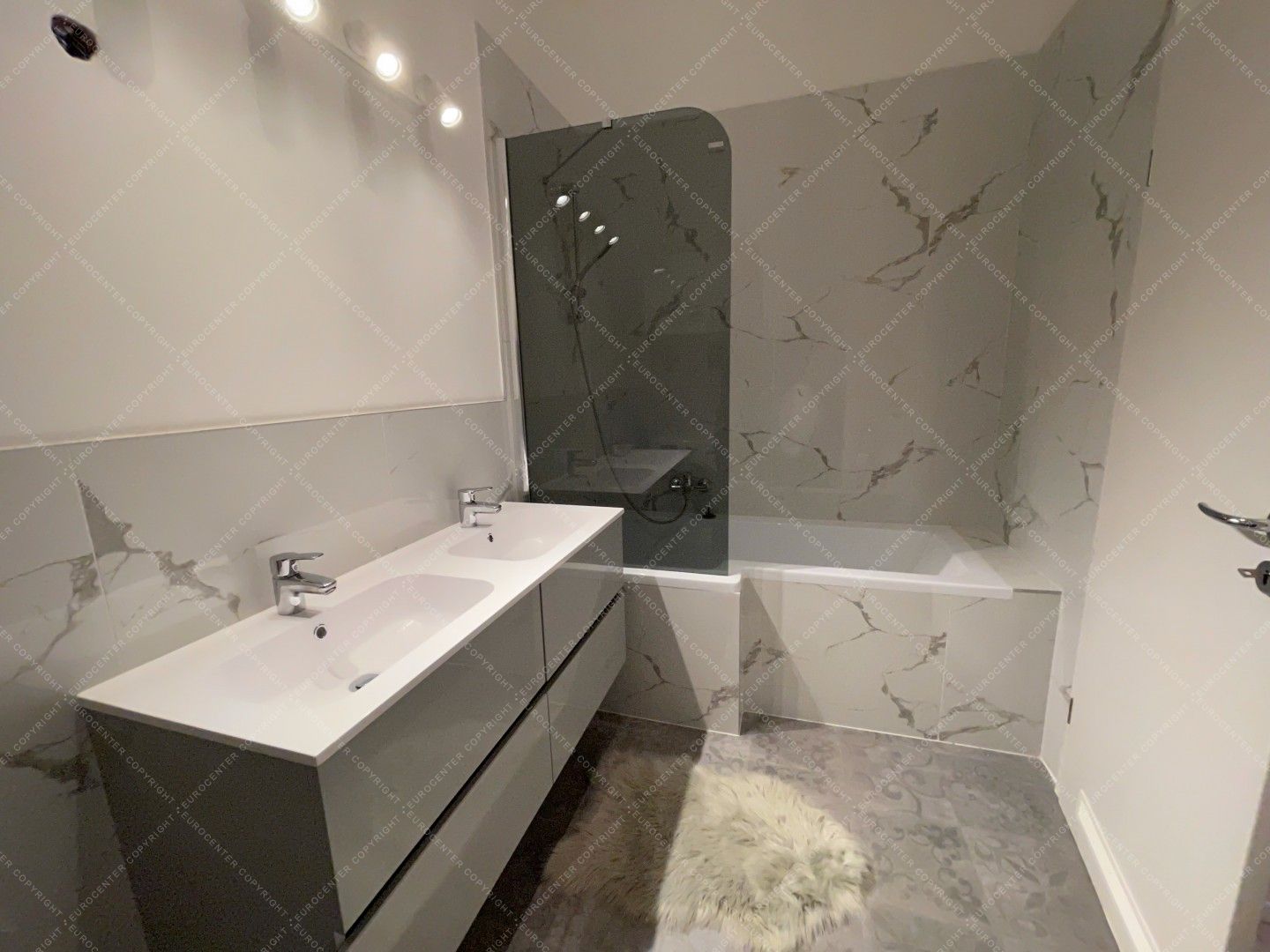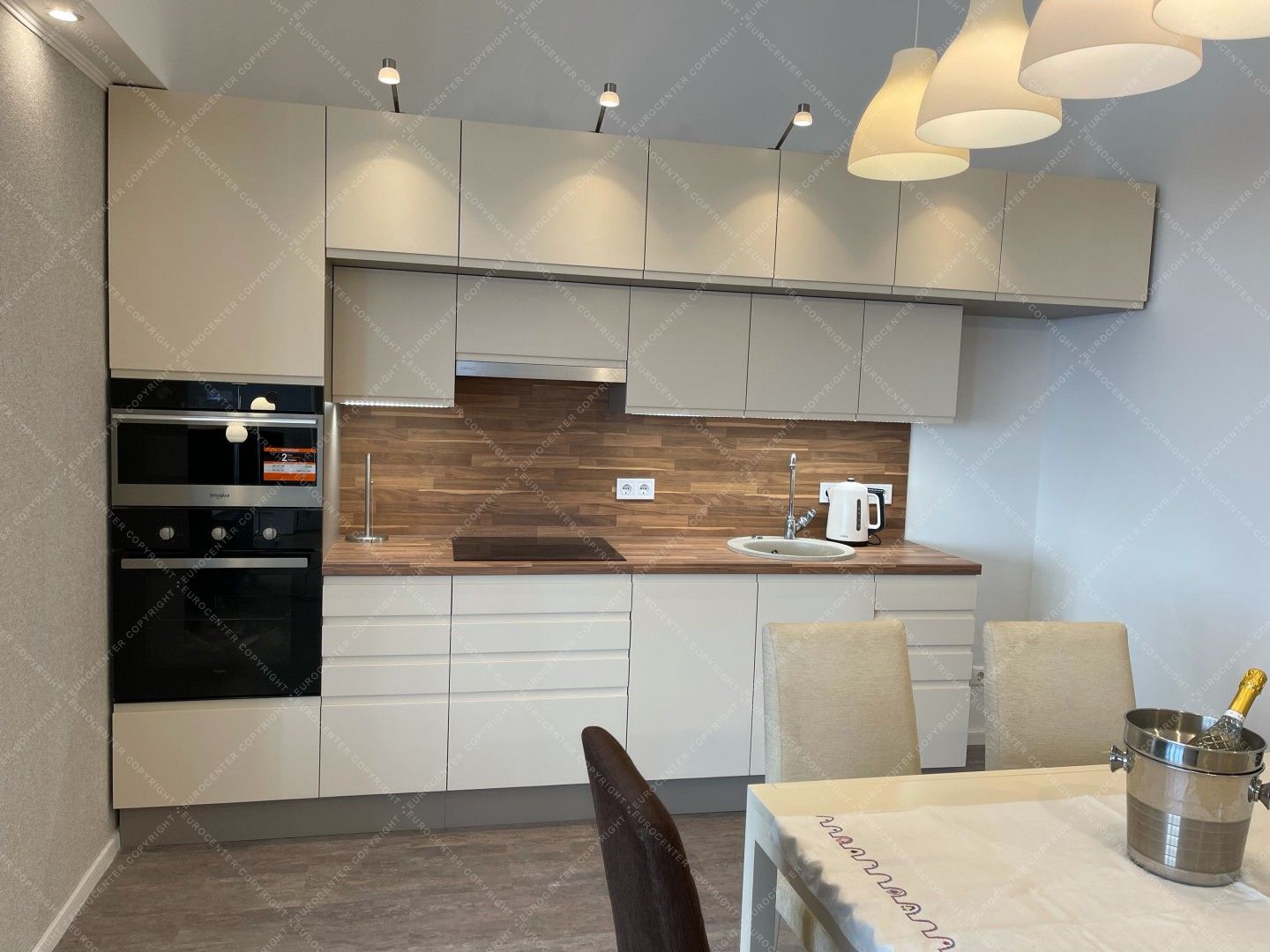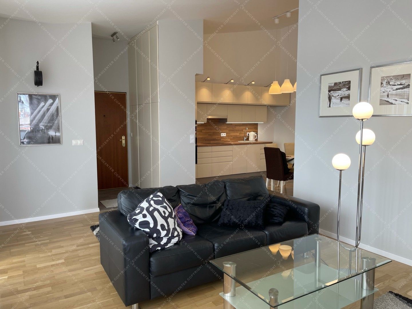 A modern, világos lakás 2 tágas hálószobából, egy nappaliból, egy felszerelt, szeparált konyhából, 2 fürdőszobából. 2 terasz (30 nm) és egy garázs szintén tartozik a légkondicionált ingatlanhoz. A házban 24 órás portaszolgálat működik.