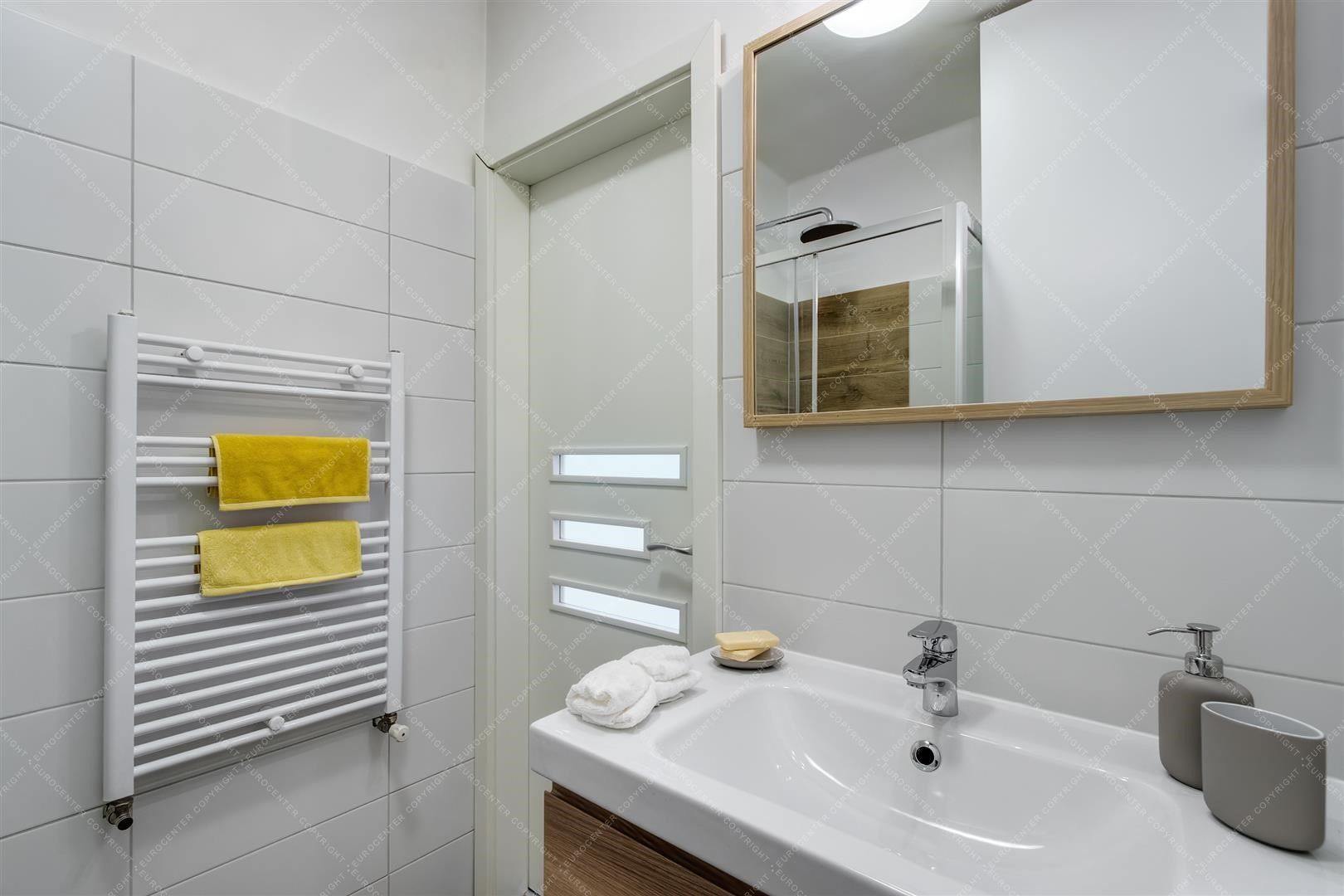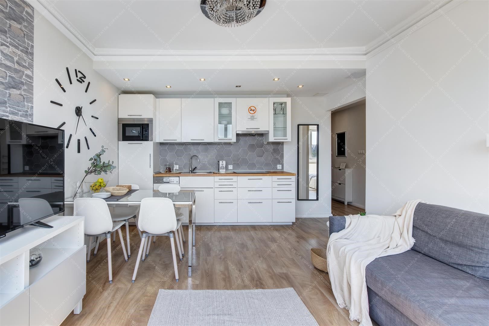 Elosztás: amerikai konyhás nappali, 2 hálószoba, 2 fürdőszoba, WC. Az ingatlan a 6. emeleten található és panorámás kilátással rendelkezik.