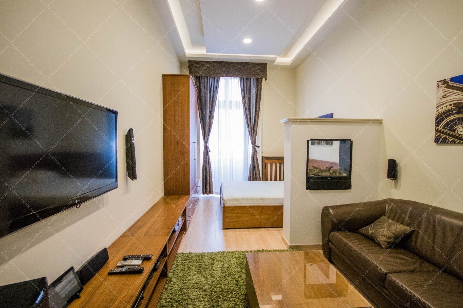 A lakás áll egy konyhás nappaliból, egy hálószobából, egy fürdőszobából, és egy erkélyből.